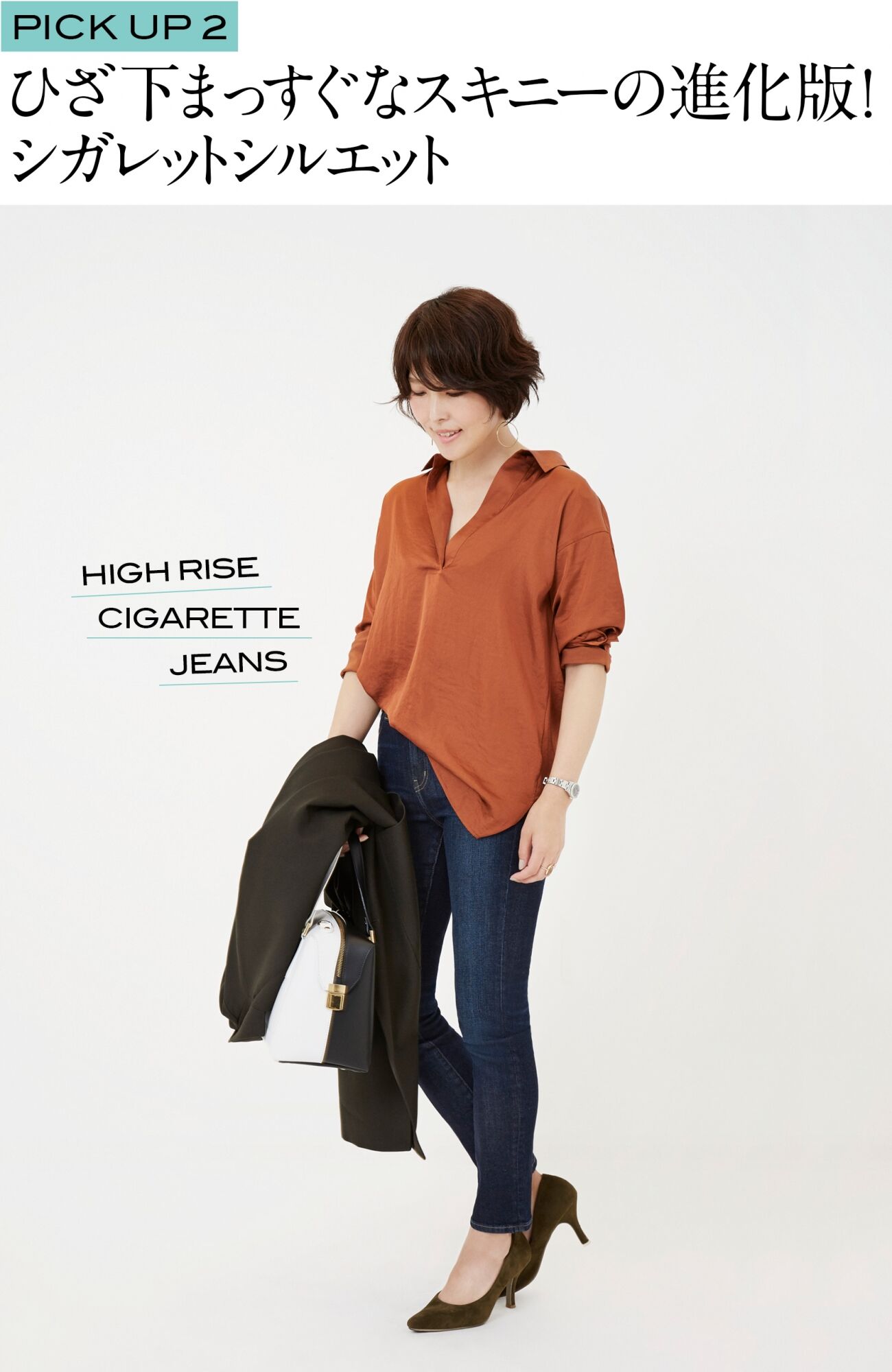 今季のボトムスの注目は、春夏から引き続き「ハイウエスト」を主流に、よりスタイル良く見せる「ワイド」と、ひざ下からまっすぐなスキニーの進化版「シガレット シルエット」の2タイプ。はき心地も快適で、しかも美脚に見せる2大人気パンツの着こなしは必見です。