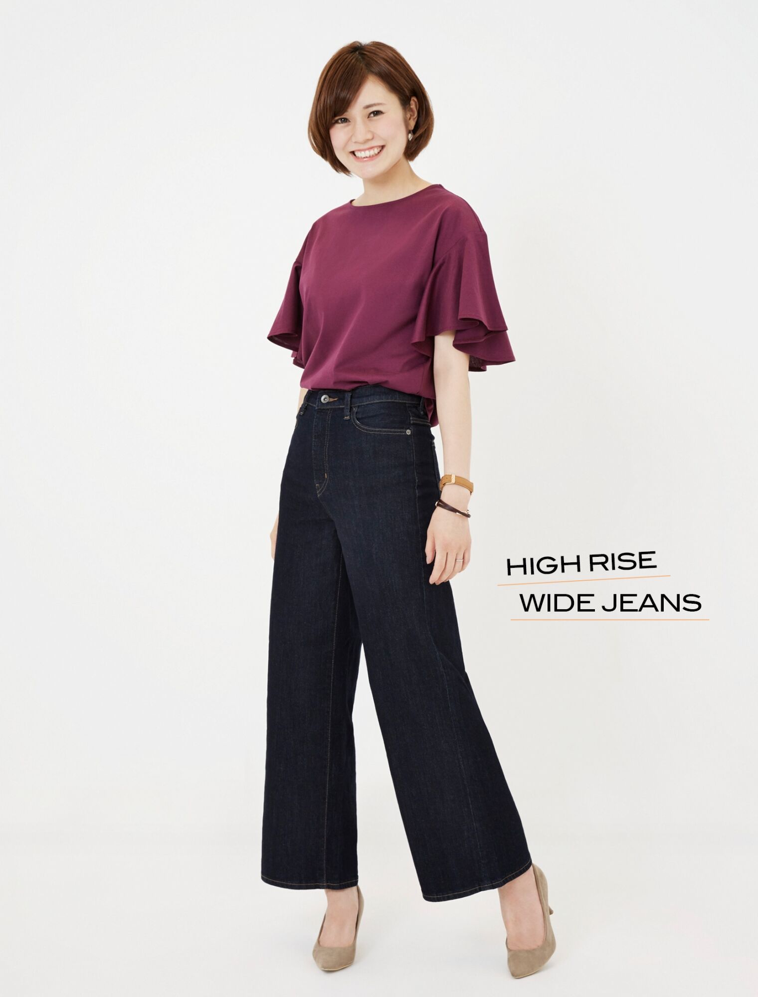 ハリ感がありながら、ストレッチ素材なのではき心地もバツグン。9分丈のジャストレングスなら、抜け感のある着こなしに。「ハイウエストのワイドデニムはどんなトップスでも今年らしく見せてくれるマストハブアイテム。今季気になるワインレッドのトップスに合わせてネイビーをチョイスしました。O脚がカバーできてスタイル良く見せてくれます」(@n.etsuu)