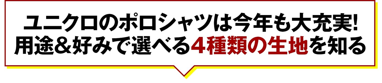 あらゆる着用シーンや好み、コーディネートに応えるべく、ユニクロには多彩なポロシャツが揃い、色柄も選り取り見取り! その目移り確実のラインナップには、素材感や機能性の異なる4タイプの生地が用意されています。それぞれの特徴を知り、自分にピッタリの一着を見つけてください。
