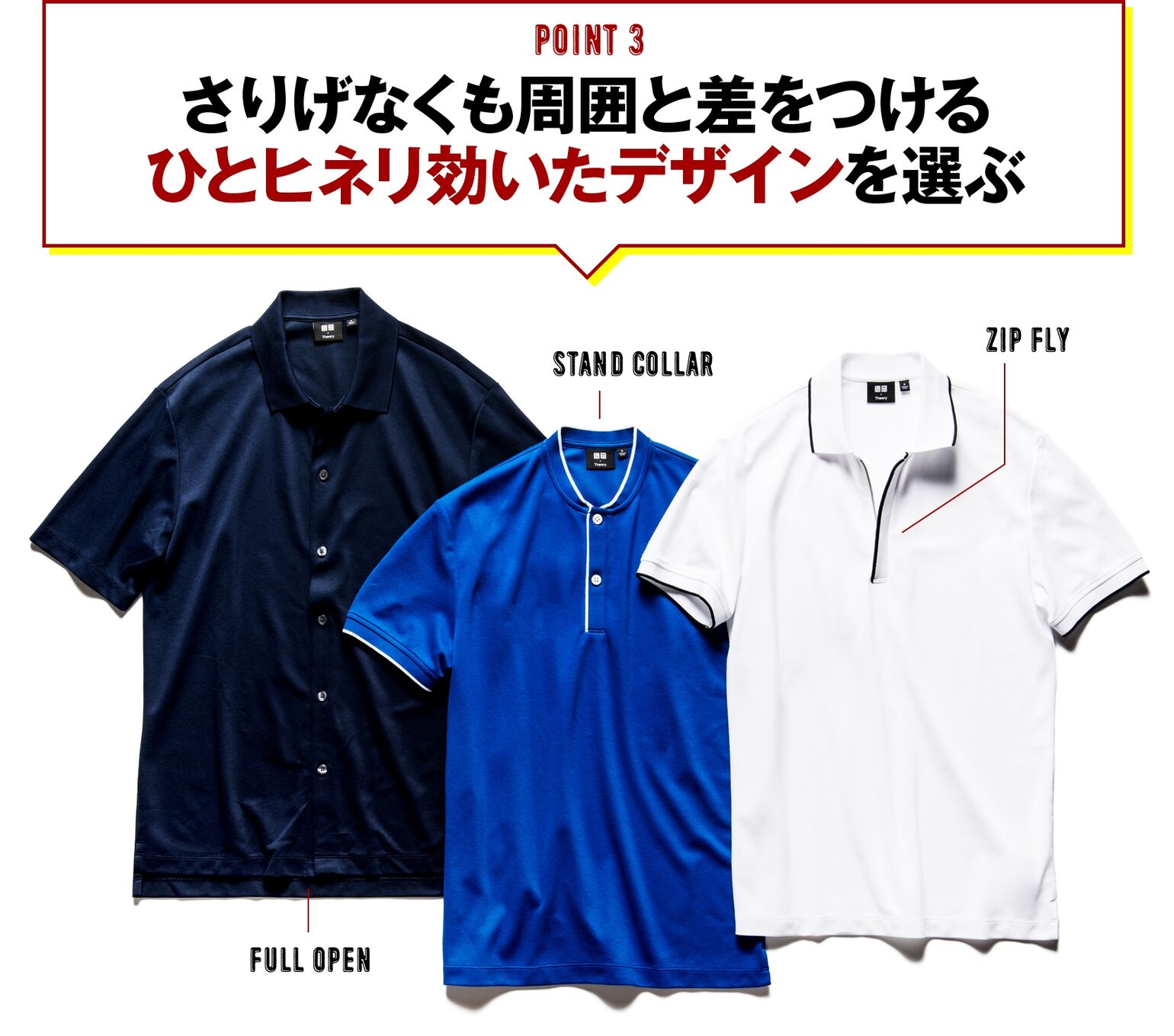 ユニクロには、洗練されたコンテンポラリー&都会的なスタイルで人気を博すNY発のブランド〈セオリー〉とのコラボによるデザインポロシャツがあり、昨年のヒットに続いて今シーズンも注目の的です。フロントがフルオープンのモデル、衿がスタンドカラーのタイプ、また胸元がジップアップといった、さりげなくもアレンジの効いた新作が揃っています。
