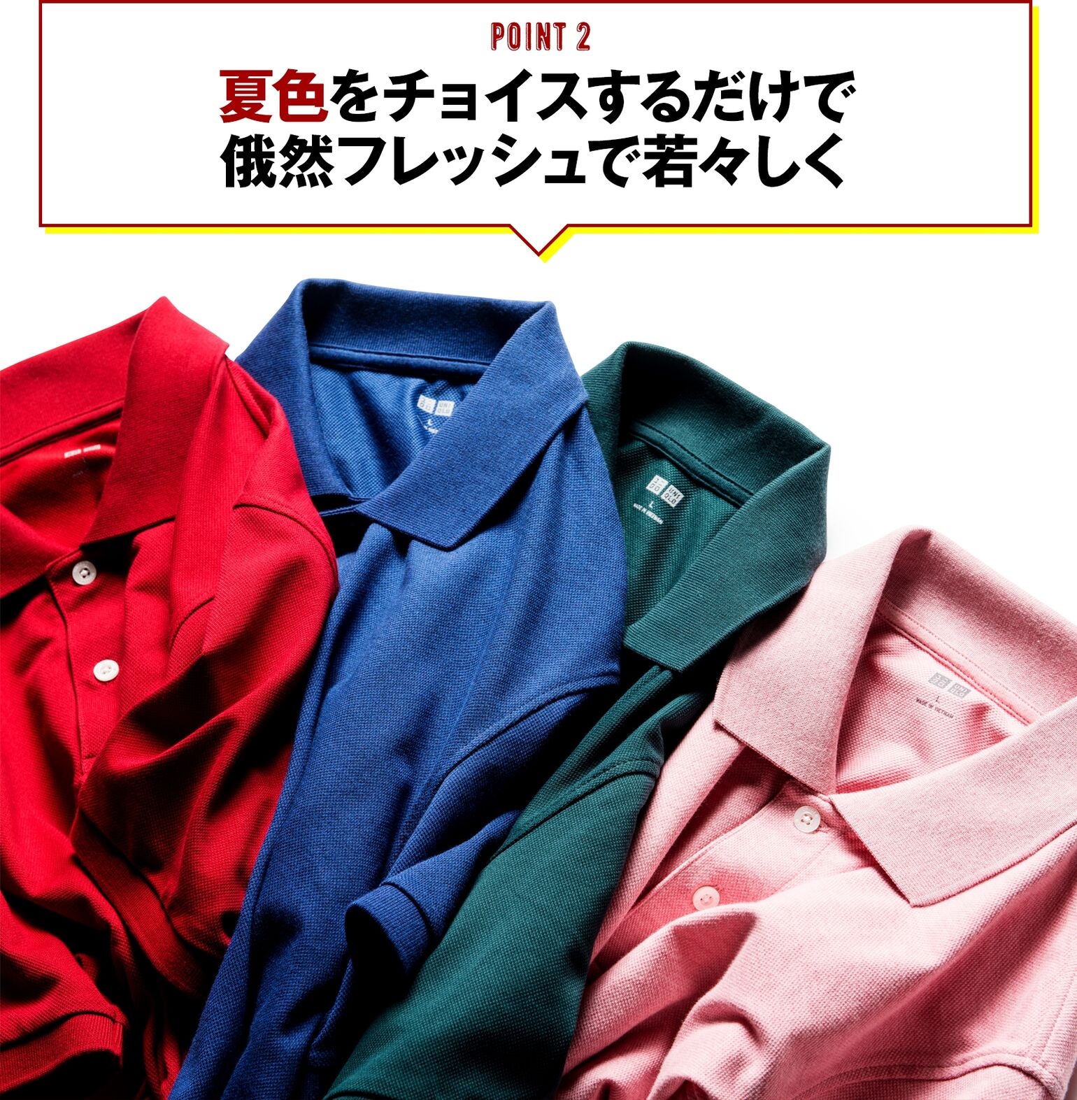 デザインもシルエットも素材も普通のポロシャツが好みなら、色使いでフレッシュさやトレンド感を添えるのが有効です。ユニクロには豊富なカラーが揃っており、なかでも目が冴えるようなビビッドカラーや涼しげなパステルカラーといった夏の彩りは流行色なうえ、一着で季節感&見映えがアップし、印象もウンと若々しく。今まで選ばなかったような派手めのカラーでも、アイテム自体はベーシックで馴染みのあるポロシャツなので、意外と素直に着こなせますよ」