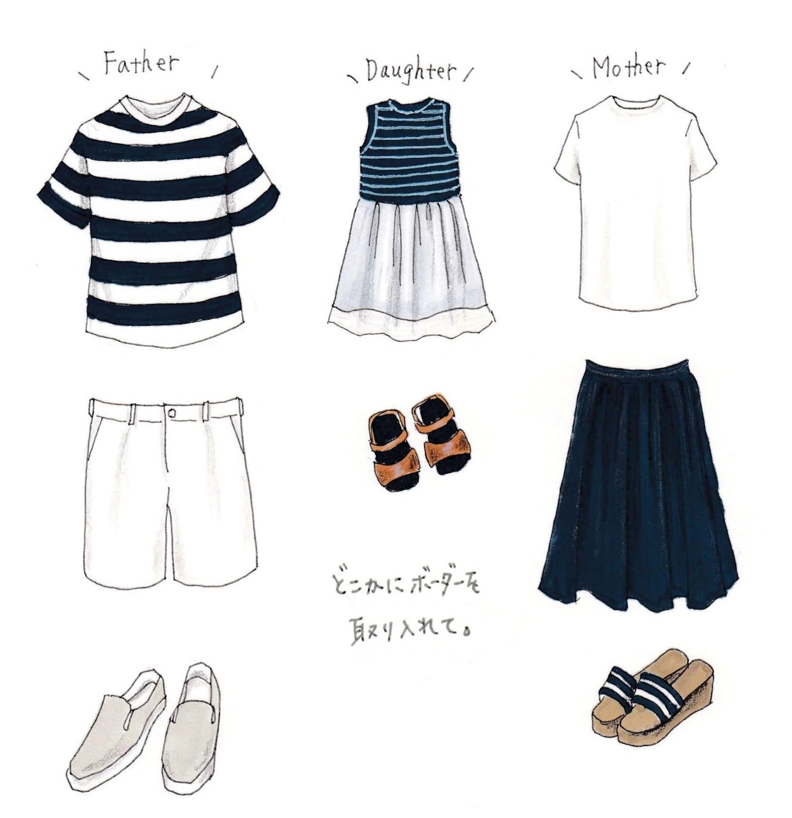 「ファミリーでのお出かけは、色のトーンを合わせるだけでぐっと楽しさが増しますよね♪ネイビー×白の組み合わせは、爽やかで夏らしいのでおすすめです。パパと女の子に合わせて、ママのサンダルもボーダーにしたのがポイント。ピッチが違うと印象も変わるので、お揃いに抵抗がある方でもトライしやすいと思います。鮮やかなイエローのサイザルバッグをアクセントカラーに、品よくまとめました」