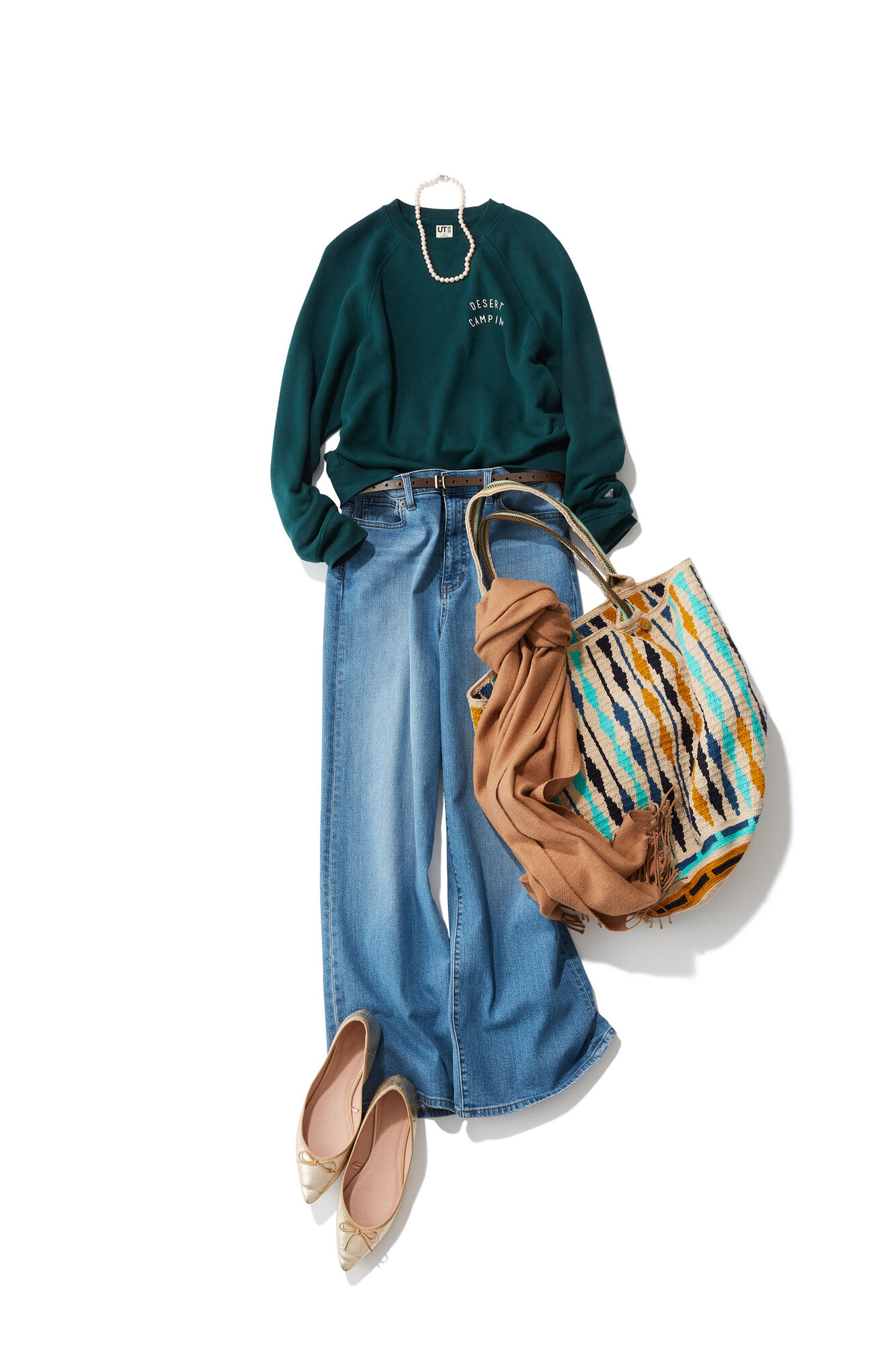 「永遠のアイテム、ロゴスウェット。とはいえカジュアルになりすぎてちょっと難しいアイテムかなと敬遠されがち。ロゴスウェットはシックなカラーを選ぶべし、です。色味を意識すればオールカジュアルアイテムのスタイリングでもうまくいきます。もう1つポイントは、小物で女性らしさを加えること。意外かもしれませんが、レディなパールネックレスや、バレエシューズなどともマッチ。大人バランスに仕上がります。ロゴスウェットを取り入れるだけで、こなれ感もリラックス感も楽しめます。ぜひトライして!」