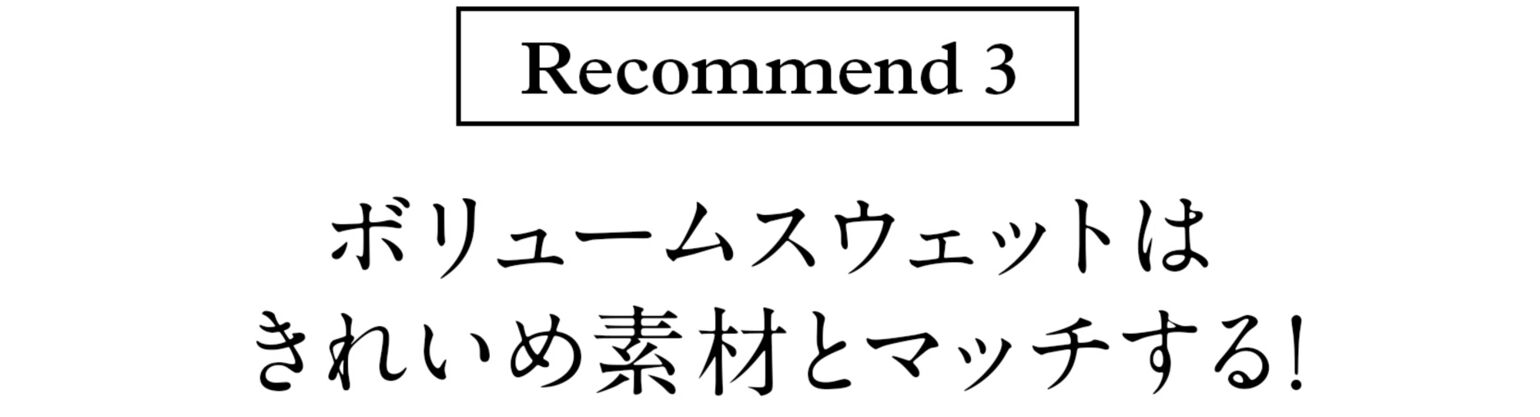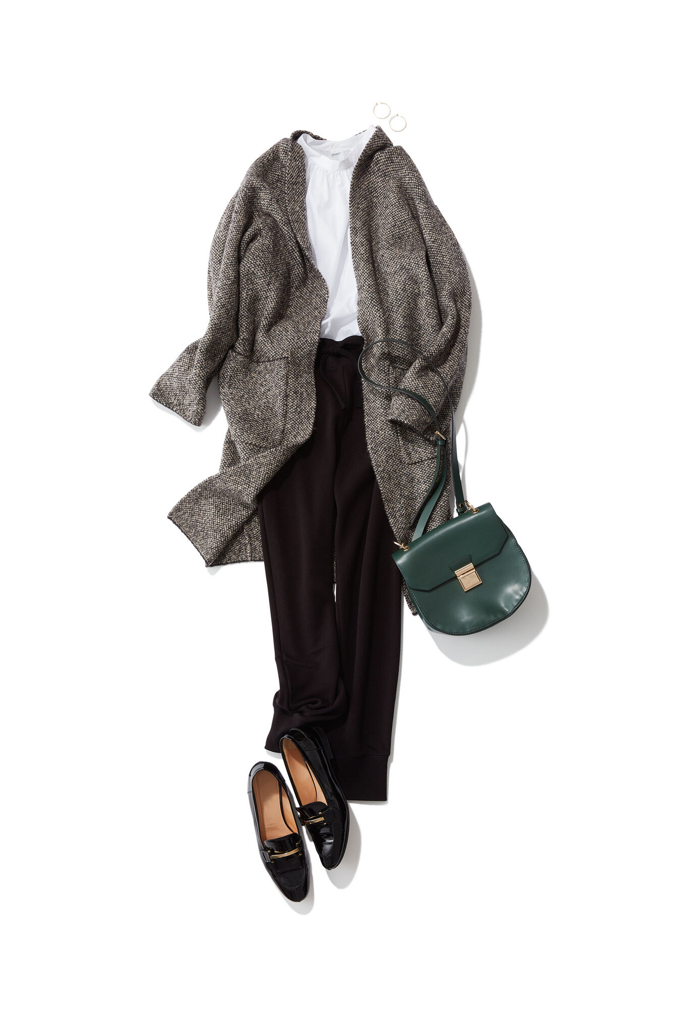 「スウェット=グレーという印象が強いと思いますが、黒をチョイスすればガラリと印象を変えることができるんです。たとえば、ニットコートとデザインの効いたブラウスの掛け合わせに合わせれば、こなれた雰囲気のスタイリングに仕上がります。スウェットならではのリラックス感はそのままに、黒なら部屋着っぽさも薄まりますよ。」