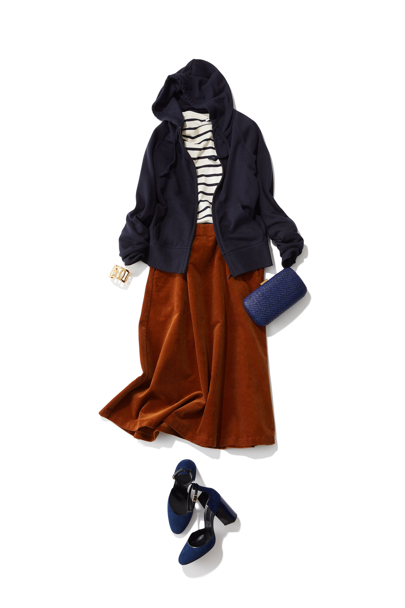 「お馴染みのパーカにボーダーカットソー。ベーシックアイテム同士のみんなが得意なスタイリングこそ、小物遊びを楽しんで。ネイビーパンプスに、パープルのクラッチなど、一見ハードルの高いアイテムこそ、着慣れたスタイリングに取り入れてみるのがおすすめです。フレアシルエットが素敵な、秋らしいこっくりブラウンのコーデュロイスカートとも相性良く、大人の雰囲気のスタイリングに。」