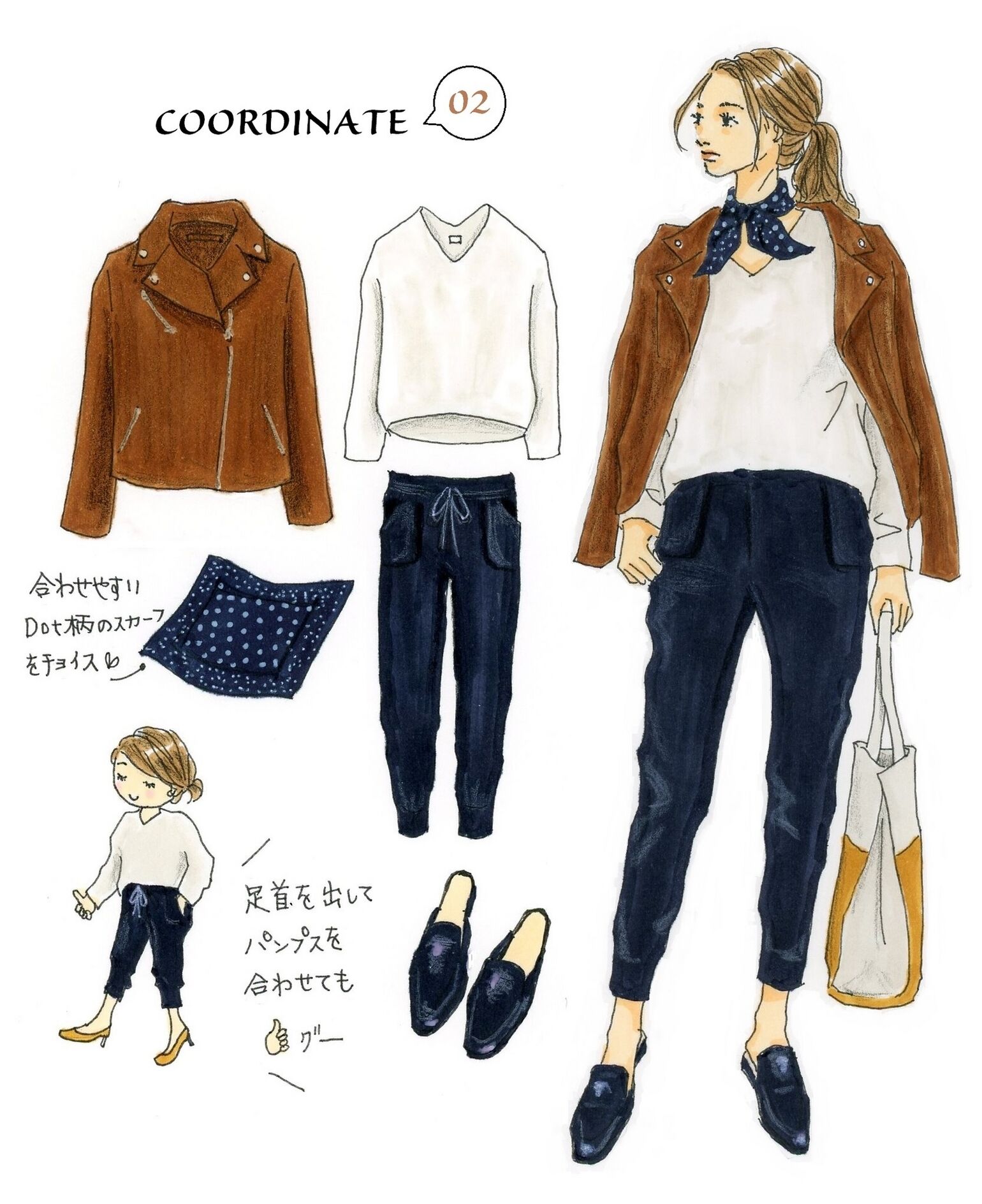 「丸みを帯びたコクーンシルエットのニットに、ブラックのボアスウェットパンツを合わせたリラックス感のあるコーディネートは、モノトーンでたちまちおしゃれ顔に。ドット柄スカーフを巻いたり、レザースリッポンを合わせたり、きれいめ小物を合わせて女っぽさをプラスしました。極め付けは、スエードタッチのライダースジャケット!レザーと違ってほど良くカジュアル感があるので、リラックスコーデとも相性抜群です」