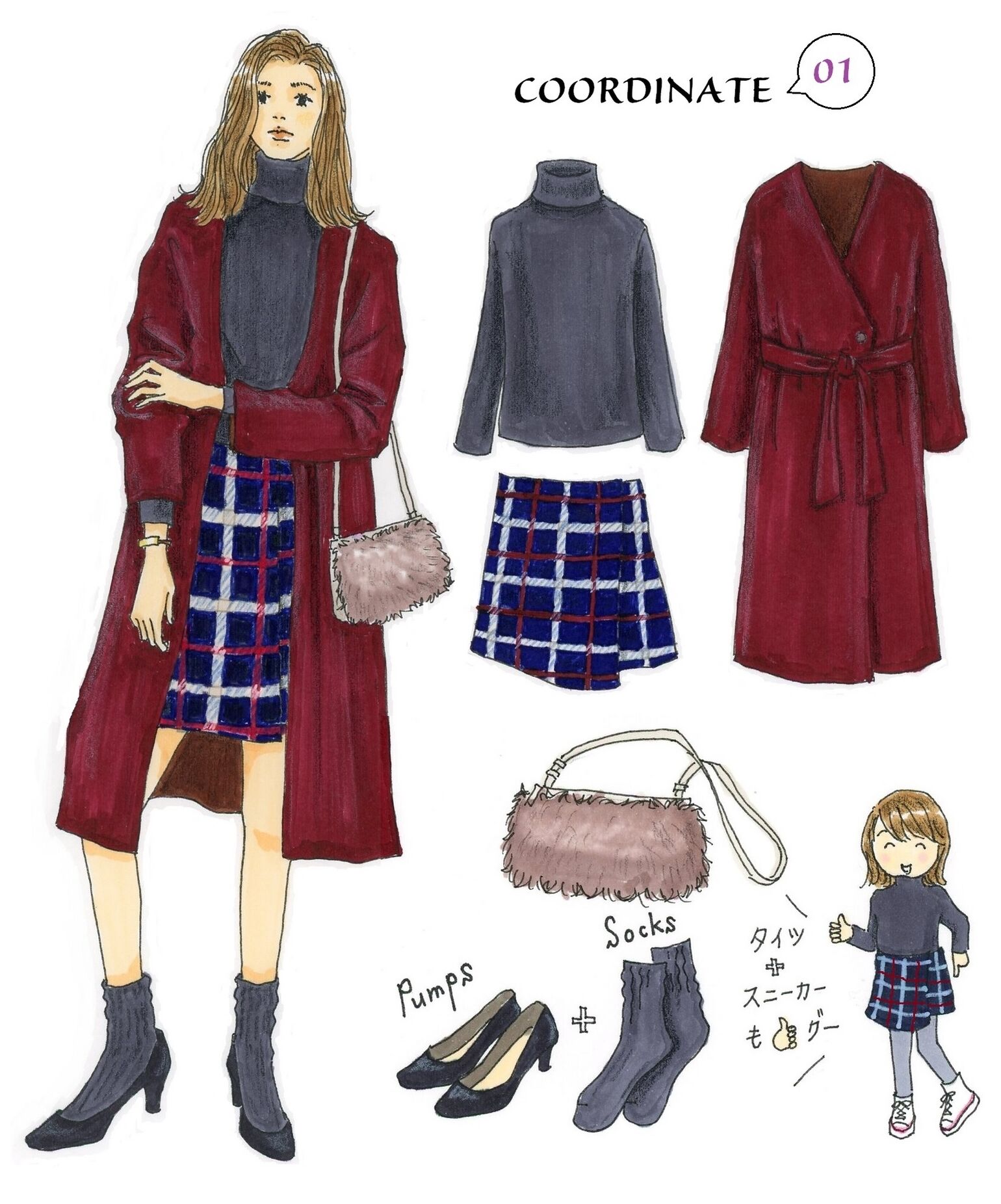 「トレンドのノーカラーコートと、今季注目のチェック柄をミニ丈のラップスカートで取り入れてみました。これまでひざ下のミディ丈がトレンドでしたが、今年はミニ丈も気になるところ。落ち着いた色味のものを選べば、大人っぽく着こなせます。アウターやニットなどで重たくなりがちな秋冬のコーディネートを軽快にしてくれるのがうれしいポイント!膝上丈に抵抗がある方は、長めアウターで肌見せのバランスを調節したり、タイツを合わせたりしても可愛く着こなせますよ」