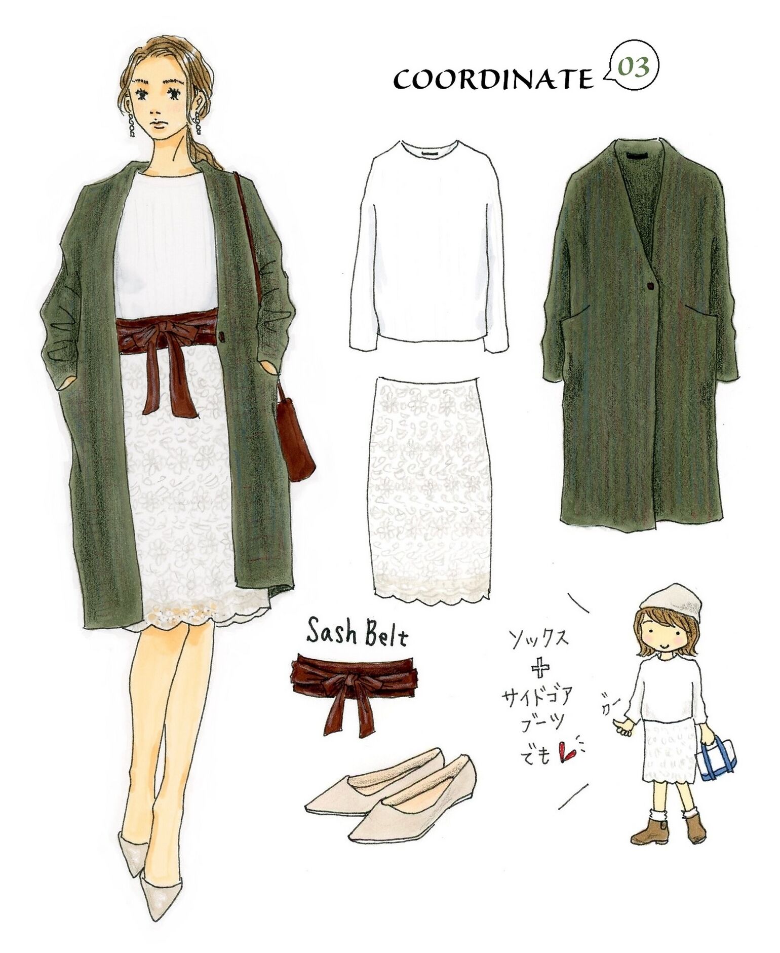 「薄手のコットンカシミヤセーターに、華やかなレーススカートを合わせたオールホワイトコーデには、ざっくりしたニットコートをオン。サッシュベルトでウエストマークしたタイトなシルエットにオーバーサイズのアウターを羽織ることで、メリハリのあるコーディネートに仕上げました。レーススカートは、実際にはいてみるとさりげない存在感があって、意外と合わせやすくてびっくり!白×深みのあるグリーンの組み合わせが爽やかで、秋のお出かけにぴったりです」
