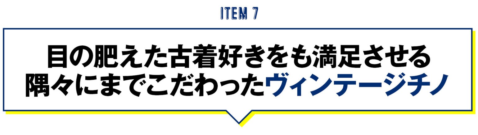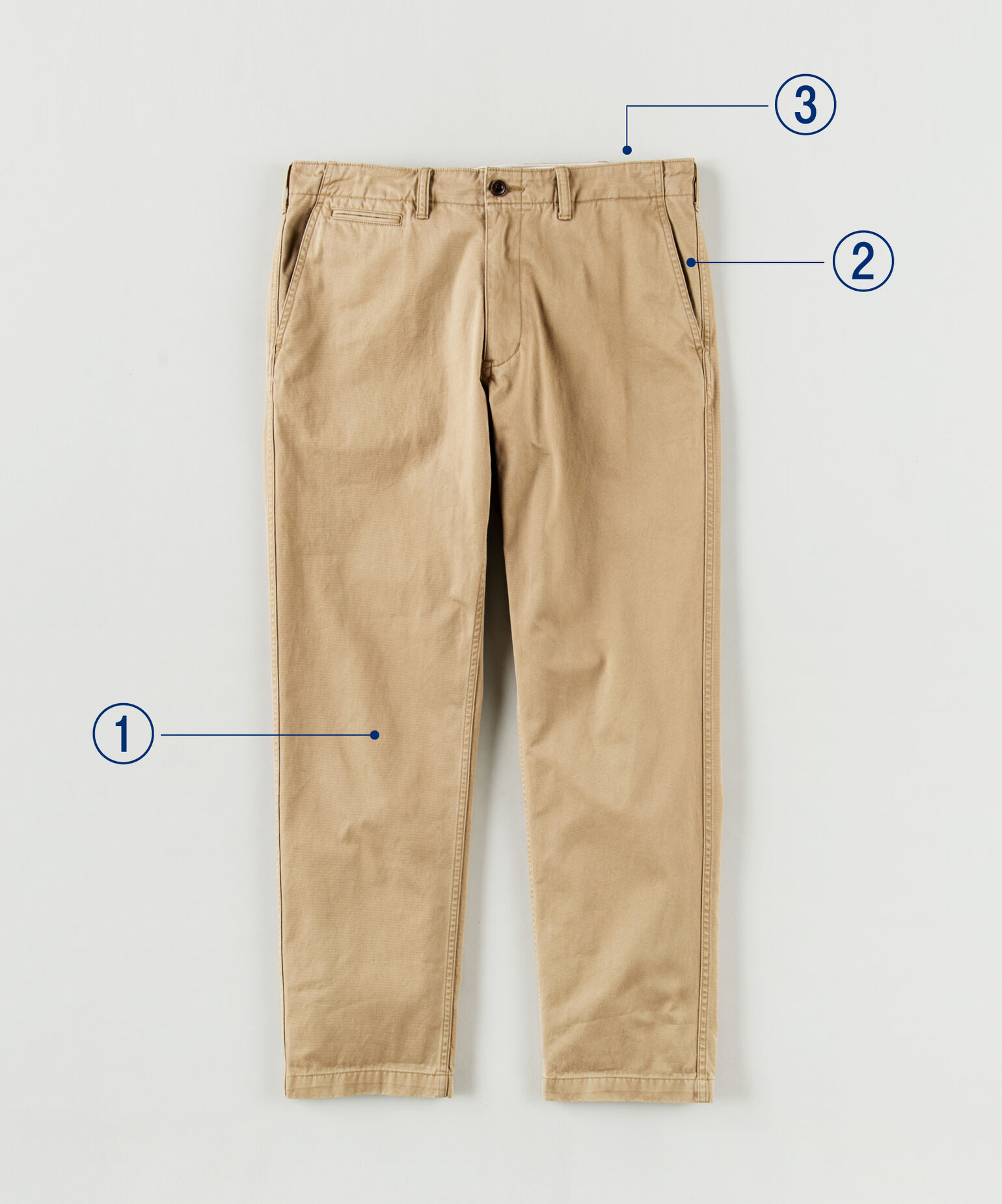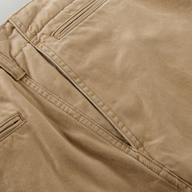「ユニクロには数種類のチノパンが用意されていますが、特に高い人気をキープしているのがヴィンテージテイストのモデルです。古き良きムラ糸で織り上げられたウエストポイント、通称 “ ウエポン ” と呼ばれる上質でハリのある高密度ツイルは、日本屈指の老舗テキスタイルメーカーであるクラボウ社のもの。また天然ナットボタン、高度な技術を要する細幅の両玉縁ポケットなど、古着好きも納得の本格的なオールドディテールが随所に。ガシガシ穿いてガンガン洗うほどに、味わい深く育つのも楽しみのひとつです」