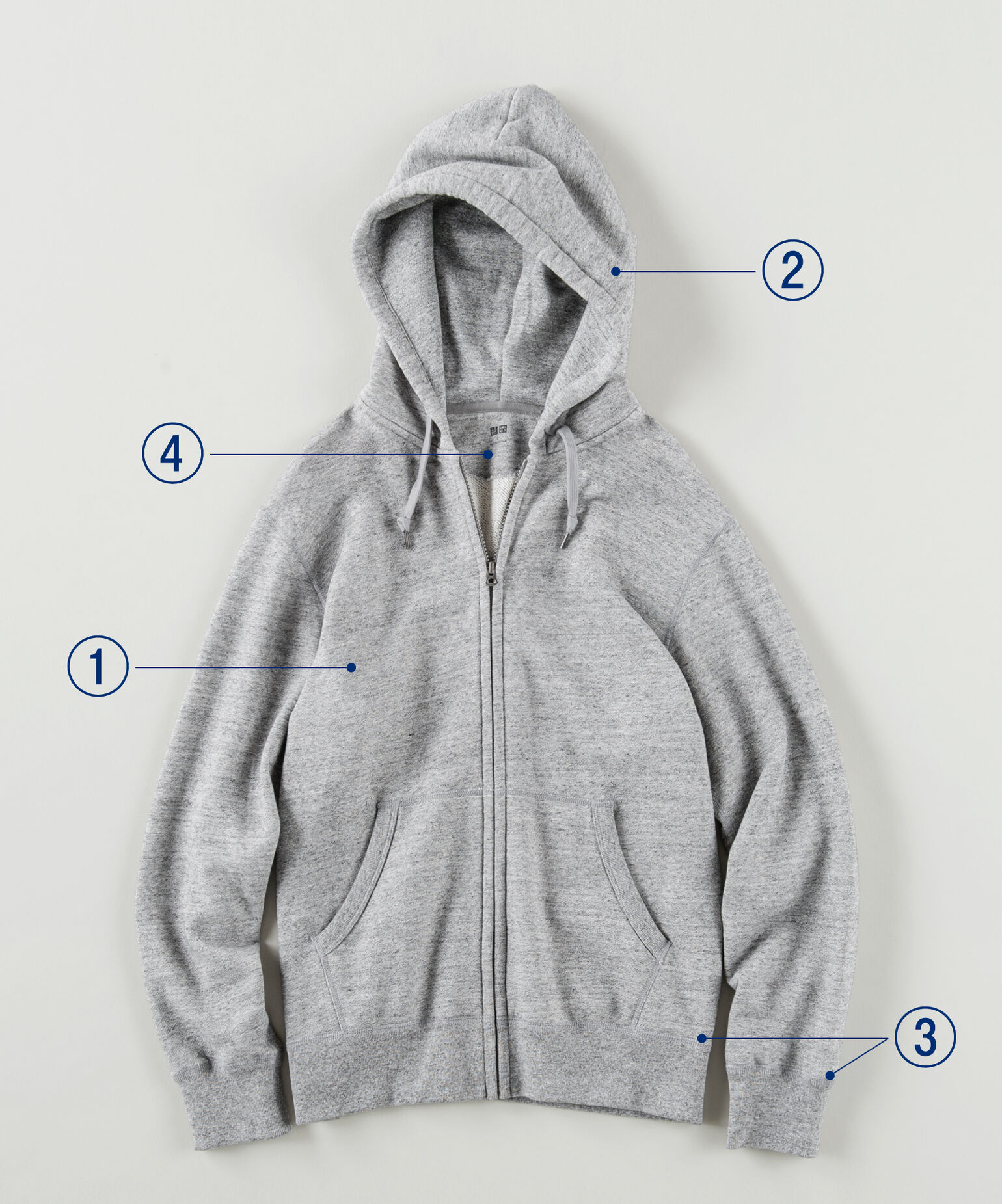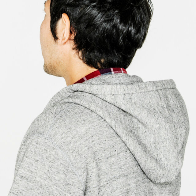 「フルジップのスウェットパーカは、数あるラインナップのなかでも指折りのロングセラーアイテムです。最新版では、トレンドのゆったりシルエットを考慮してボディや腕回りのゆとりを増やし、以前よりレイヤードしやすくなるなど着回し力がアップ。一方、野暮ったく見えないよう細部はスッキリとさせているのがポイントです。また、ポケット口や縫い目などヘタリやすくダメージを受けやすい箇所は、丈夫な素材や補強ステッチによって強度が高められています」