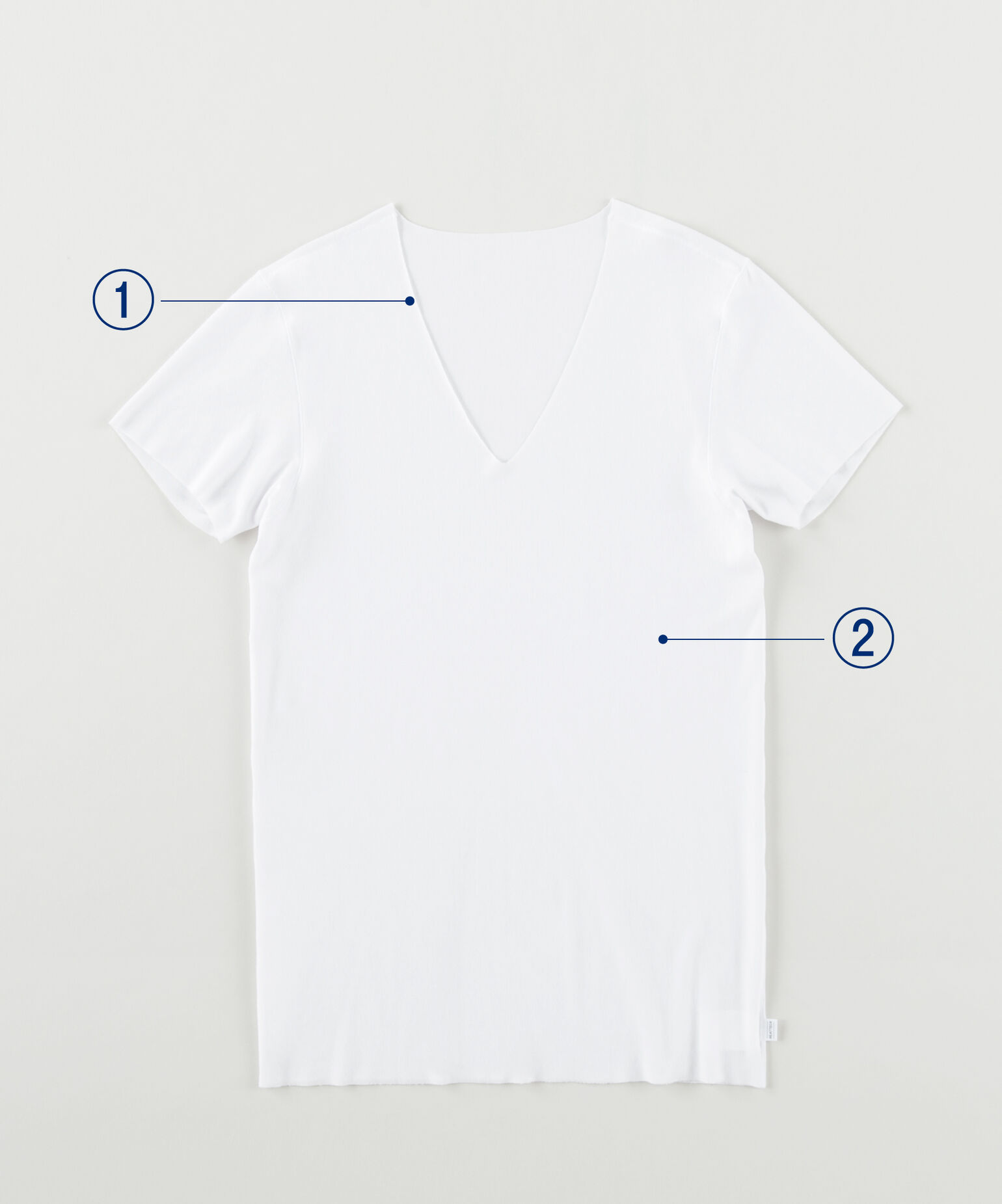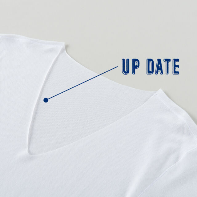 ネックライン、袖口、裾口がステッチのない切りっぱなし処理になっているため、薄手のトップスの中に着ても響きにくい。またシャツの第1~2ボタンを開けたり、Vネックのニットと合わせても首元から見えないよう、ネックラインは深めに設定されている。