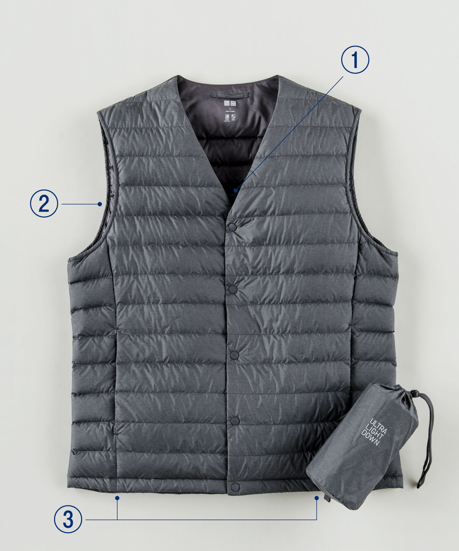 「薄く軽く、でも暖かい。そして撥水加工で小雨くらいはヘッチャラ。さらにはメインのアウターにも中間着に挟むインナーダウンにもなるうえ、付属の収納ポーチに入れてコンパクトに持ち運べる。と、ウルトラライトダウンのコンパクトシリーズは、とにかく使い勝手抜群です。それがアップデートを経て一段と便利に。なかでも今年のダウンベストには、ブラックやネイビーといった万能色に加え、程良いアクセントになるワインやブラウン、ビジネススタイルにも合わせやすいマットグレーが仲間入りしました」