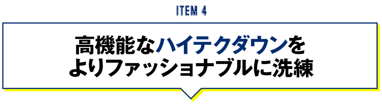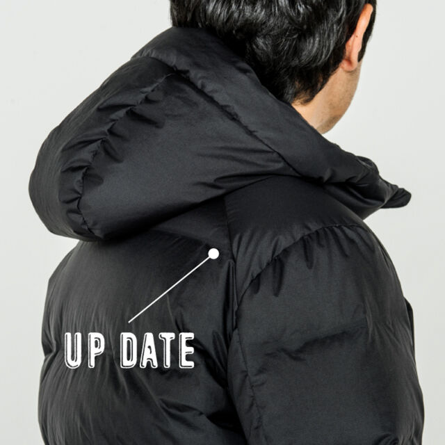 「ステッチの代わりに圧着テープでキルティングすることで、羽毛の噴出を防ぐと同時に、針穴からの雨や風の侵入もなくすことができるシームレス構造を採用。加えて、内部のダウンパックが不要なため一段と軽量になり、さらには止水ジップや撥水加工、袖口からの冷気の入り込みをシャットアウトするインナーリブなど、機能性に優れたハイテクモデルです。薄手でも破れにくい表地のリップストップナイロンはマットな質感で、新作では裏地も同色になってグッとシックに。またフロントを開けた際もフードがキレイに立つよう改良され、いっそう洗練度が高まりました」