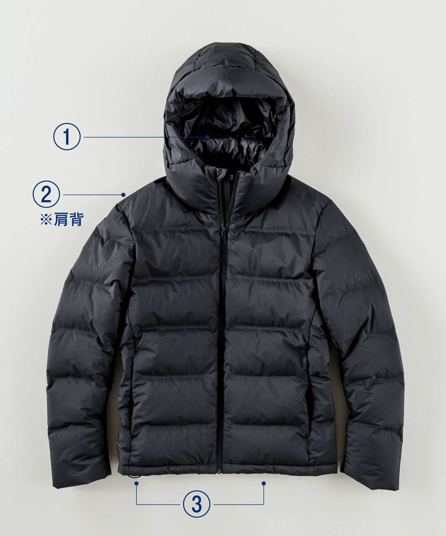 フードの内側にダウン入りのスタンドカラーを設け、首回りの防寒性を向上。
