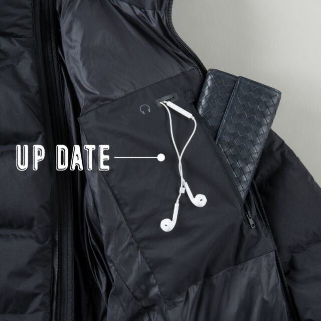 新たに設けられた2つの内ポケットにより収納力がアップ。長財布も収まる左身頃の内ポケは、セキュリティも安心なジッパー付き。またスマートフォンや携帯音楽プレイヤーを入れ、それと接続したイヤフォンを通せるコードホールも便利。一方、右身頃の裾裏に配置されたポケットは、文庫本なども余裕で収まる十分な容量を確保。