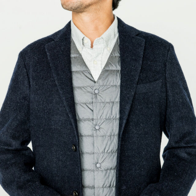 昨年より4cmほどVネックが深めになったことで、上にアウターを重ね着した際にも首元からダウンベストが覗きにくく。また写真のようにテーラードジャケットとのコンビもバランス良く。