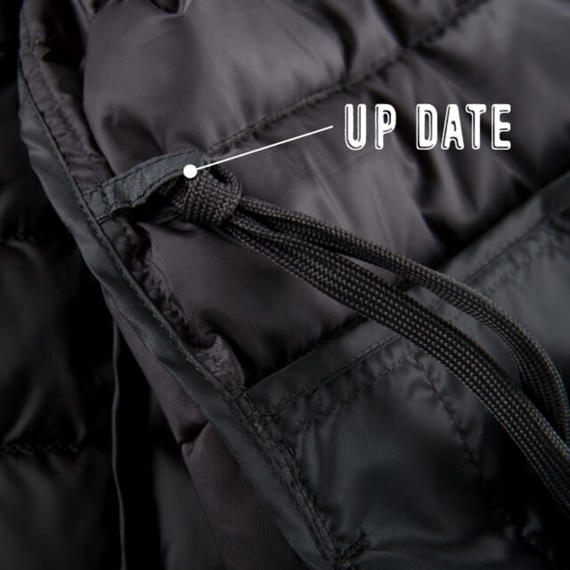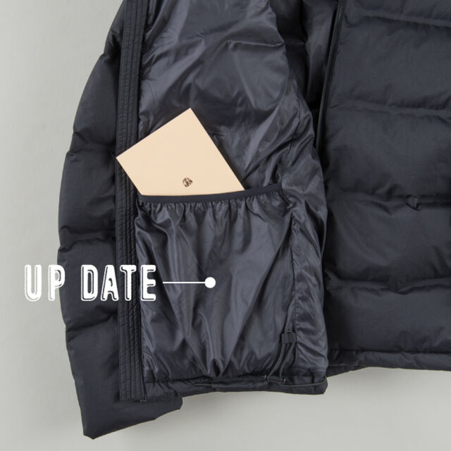 これまで着用時の保管場所が悩ましかった付属のポケッタブル用ポーチを収納できるよう、身頃裏に専用ポケットを新設。併せてポーチの紛失防止のため、そのヒモを留められるループも追加された。