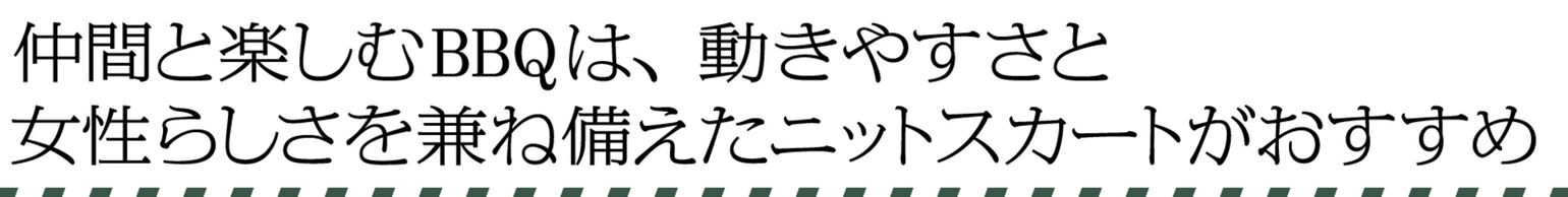 「秋の行楽ではアクティブに過ごすことが多いですが、動きやすさばかり重視すると、パーカにジーンズとラフになりすぎてしまうことも多いですよね。例えば週末に仲間とワイワイ楽しむBBQでは、スカートスタイルもおすすめです。伸縮性があるニットスカートなら、動きやすくカジュアルスタイルにもぴったり。屋外は気温差が激しいので、脱ぎ着しやすいレイヤードスタイルにするのがポイントです」