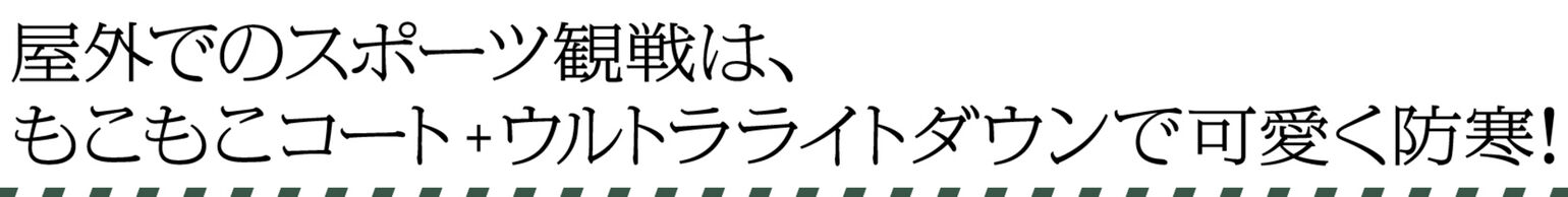 「屋外で長時間座ったままのスポーツ観戦は、冷え対策が重要なポイントです。暖かいラムブレンドのニットワンピは、レースアップのサッシュベルトでウエストマークしました。アウターには、もこもこの風合いが可愛いボアフリースコートがおすすめ。フリース素材なので、軽いだけでなく保温性も抜群なんです。さらに寒くなってきたら、コートのインナーにウルトラライトダウンを仕込んで。足元にヒートテックタイツをはいておけば防寒はバッチリです!」