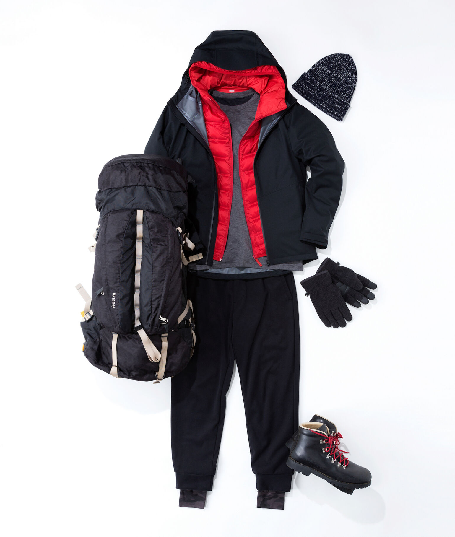 「登山など遭難の危険性がある場所では、もしもの時に派手な色の方が発見しやすく安全なのですが、かといって派手なアイテム同士を組み合わせてしまうと、コーディネートとしては失敗しがち。なので、あえてモノトーンで全体をコーディネートしておき、そこに差し色的に1色だけ使う、というのをオススメします。今回は僕自身が好きなカラーリングでもある、ブラック×レッドでまとめてみました。あくまで差し色は1色だけにしておくのがポイント。また気温に合わせてダウンを脱いだとしても、ほかがモノトーンならまとまりを崩さない!というわけです」