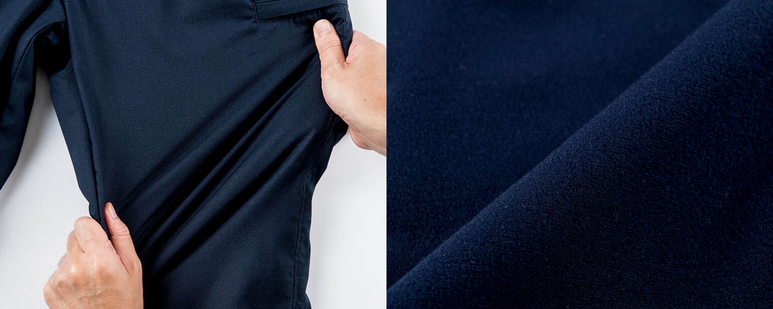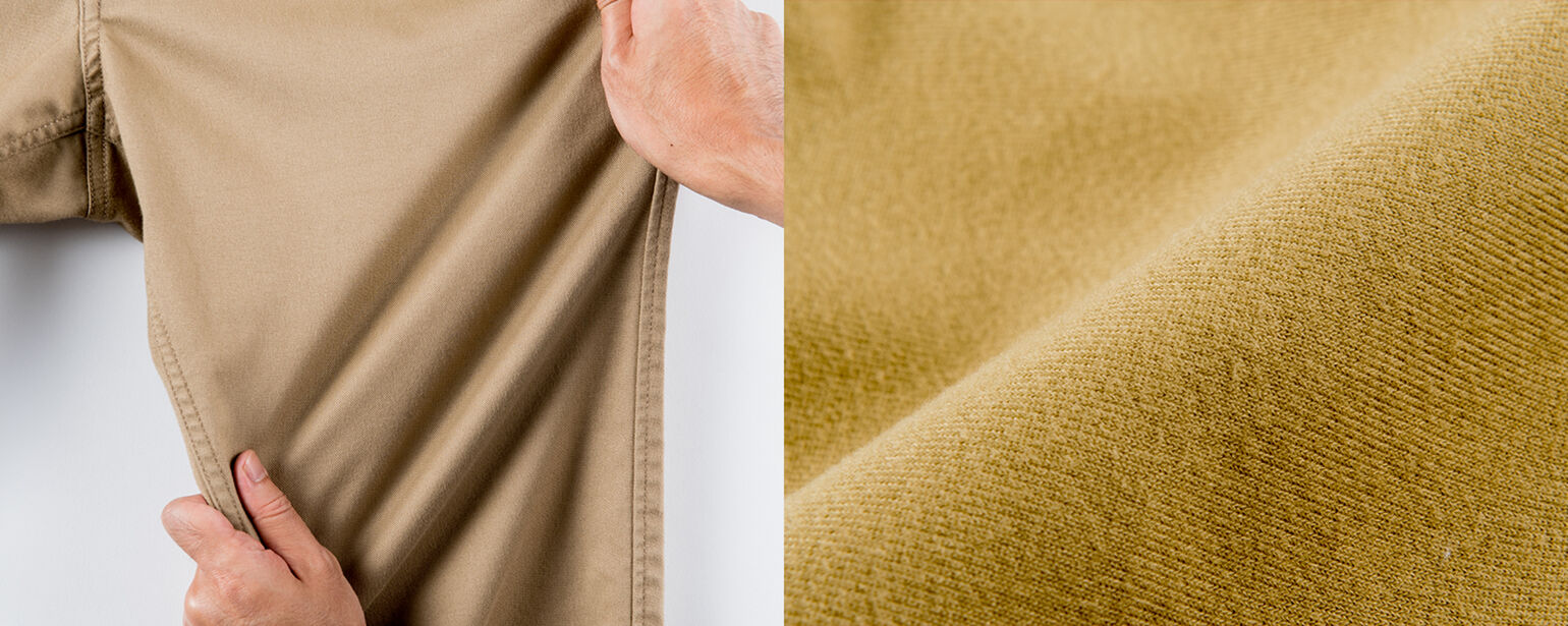 ルックスはオーセンティックなチノ生地ですが、裏にソフトで暖かな起毛トリコット素材が張られているので、特殊フィルムによる防風機能に加え、優れた保温性も実現されています。しかもストレッチが効いているため、とてもコンフォータブルです。