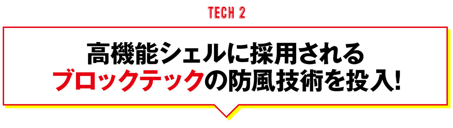 『ブロックテック』とは、優れた防風性を備えた薄い特殊フィルムが使用された高機能素材のこと。体温を奪う冬の寒風をハイレベルでシャットアウトしてくれます。