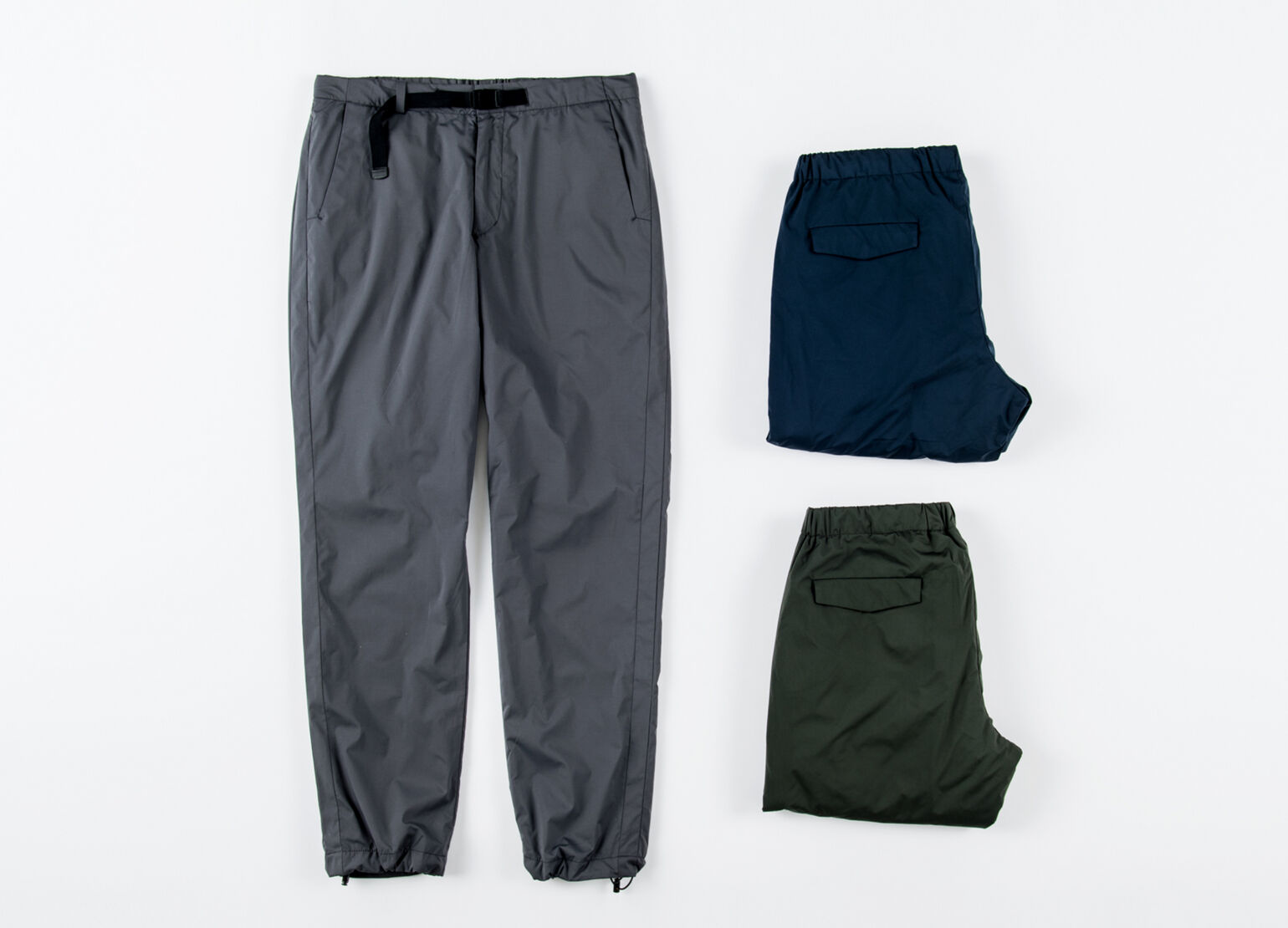 シルエットは、余分なダボつきを削ぎ落としながら、動きやすさにも配慮した適度にスッキリ感のあるテーパードフィット。裾からの冷気の侵入をブロックすると同時に、丈を上げたり、好みで絞ったり、ブーツインしやすいよう、裾口にはドローコードも。また股下79~82cmの標準丈に加え、オンラインストア限定販売で股下73cmのタイプも用意されています。