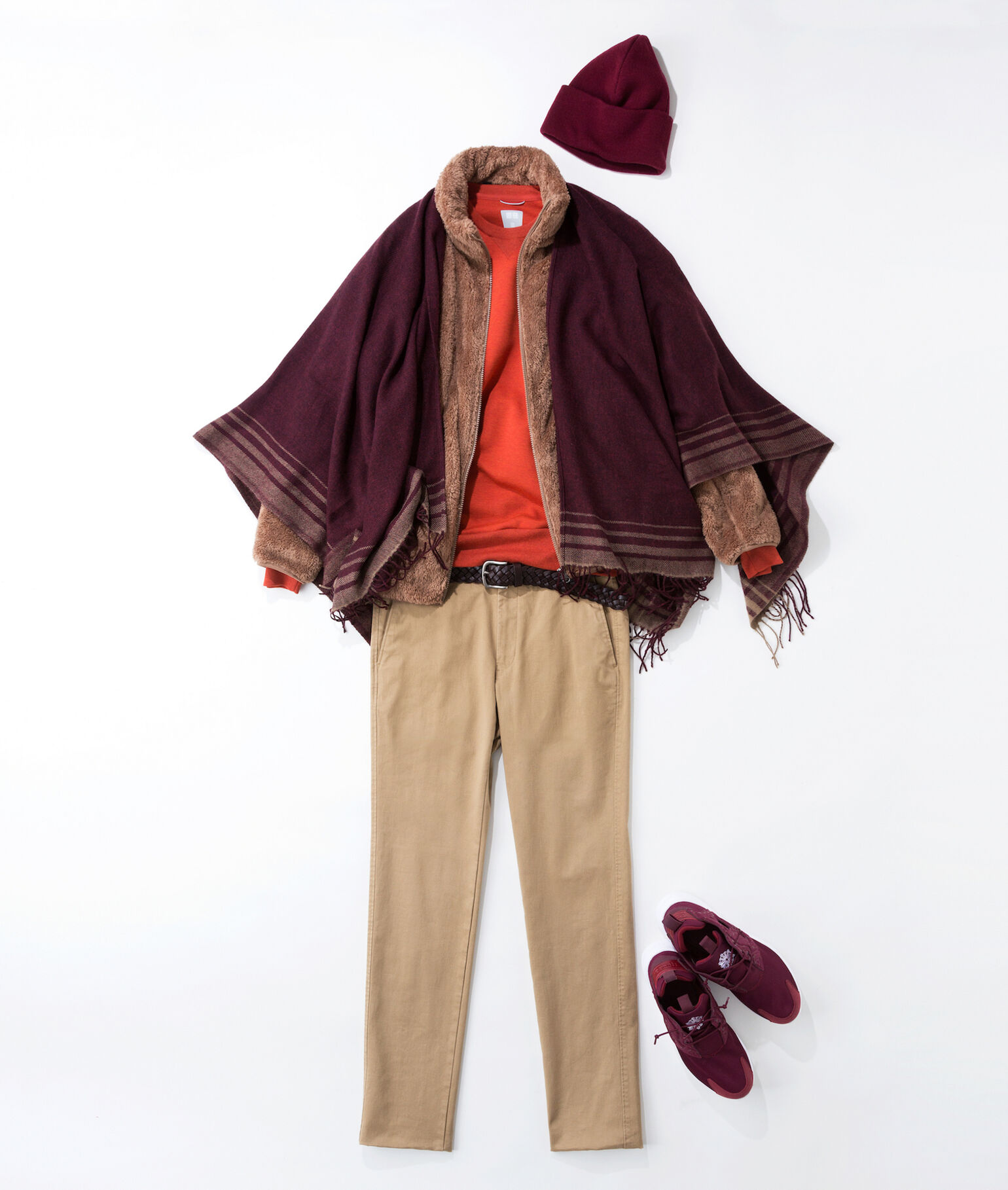 「秋冬のキャンプの楽しみのひとつと言えば焚き火。でも火にあたっている体の正面は暖かいとはいえ、意外と背中は寒いものです。今回はそんなシーンを想定してコーディネートしてみました。ストールの下には起毛した雰囲気のあるフリースジャケットを。フリースは通気性があるので単体だと保温性はあまり高くありませんが、2wayストールで風をブロックすることで、温かさが格段に上がります。そしてインナーには差し色としてオレンジを選んでみました。焚き火は寒い時期のキャンプならではの醍醐味。しっかり防寒して楽しみましょう!」