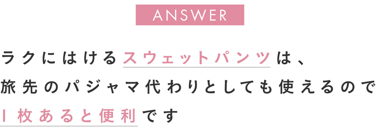 「旅行のときに1枚あると便利なのが、ラクにはけるボトムスです。ユニクロのスウェットパンツは、すっきりシルエットなので、ホテルの近所を散策するときなどにもぴったり。特に海外のホテルは、日本のように館内着を置いていないことがほとんどなので、パジャマ代わりにもなるラクちんボトムスは持っておいたほうが良いでしょう。寒いところでは、裏ボアがついたタイプが特におすすめです!」