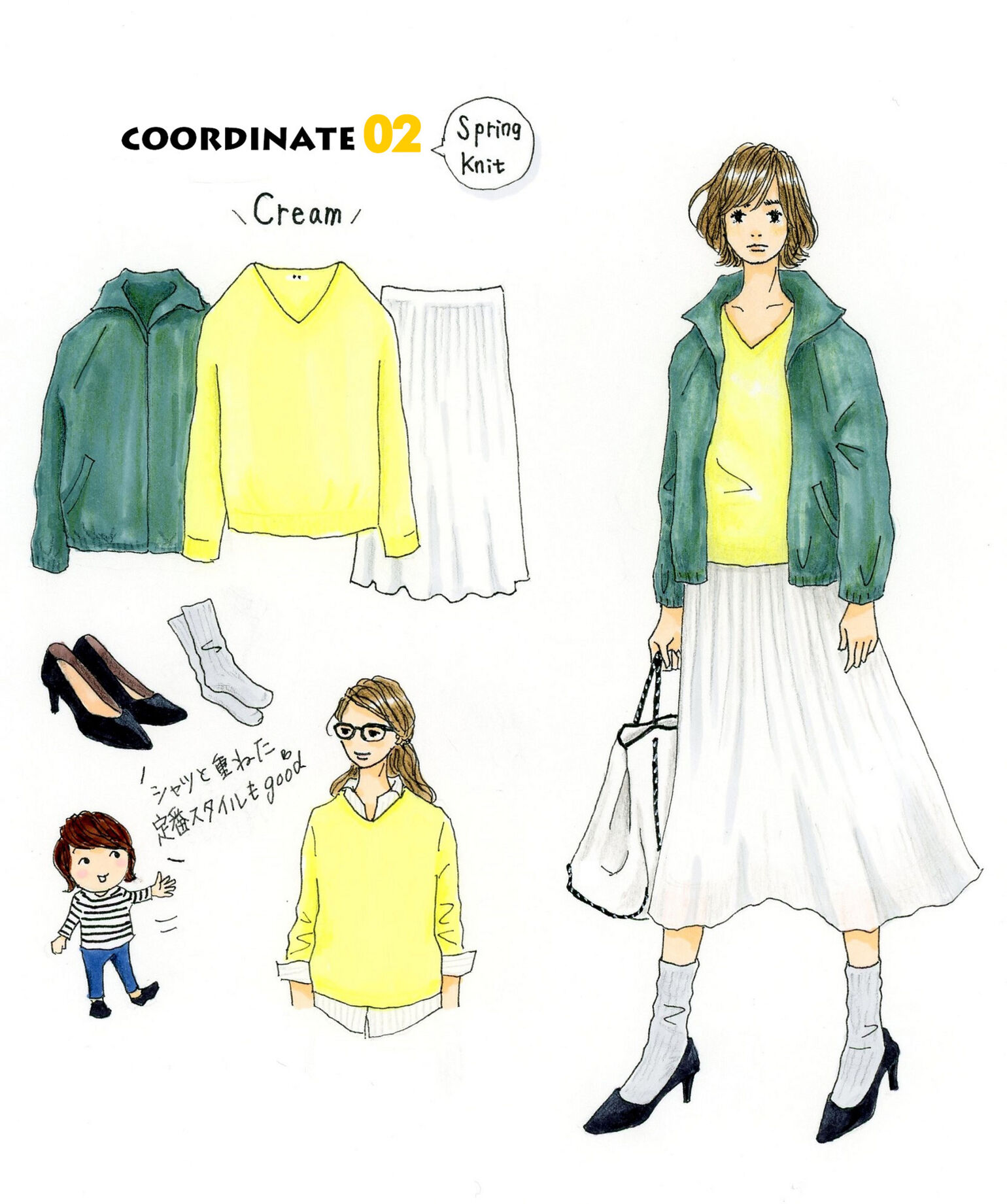 「春はやっぱり明るい色を取り入れたくなりますよね。おすすめは、鮮やかなクリームイエローに春らしい若草色を組み合わせたさわやかなコーディネート。スポーティなナイロンブルゾンに、あえてフェミニンなシフォンプリーツスカートを組み合わせて、トレンドのスポーティMIXスタイルに仕上げました。足元はパンプスに分厚いリブソックスを組み合わせたのがポイントです。Vネックニットは白シャツと合わせてもまた違った表情になるので、今からコーディネートの妄想が膨らみます♪」