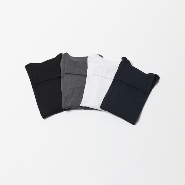 「タートルTのカラーバリエーションはこちらのベーシックな4色とワインカラーの計5色。ほかにクルーネックも選べます」
