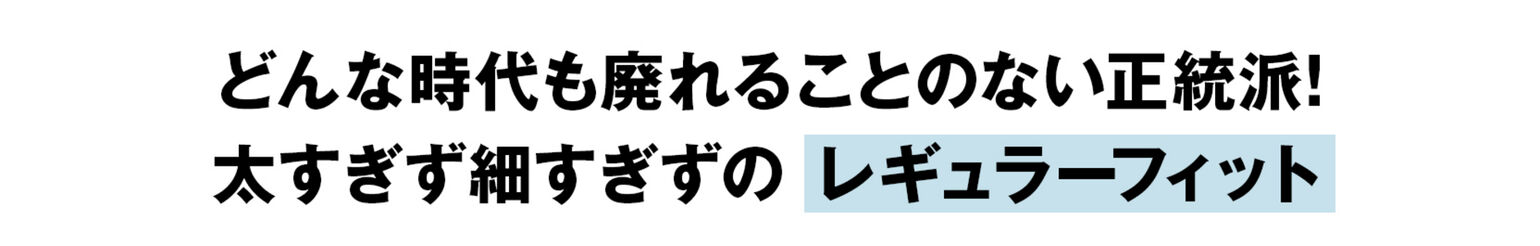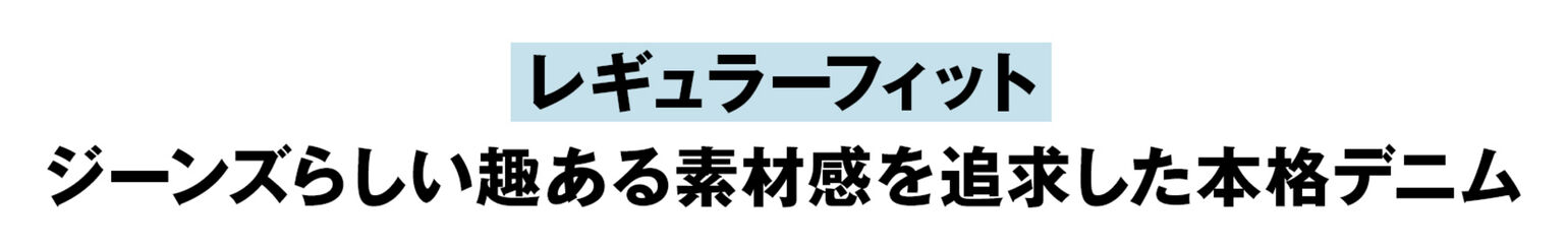 「レギュラーフィットは、昔ながらのオーセンティックな一本を追求した王道のストレートモデルです。股上は深くも浅くもなく、レッグラインも太すぎず細すぎずとなり、“ これぞジーンズ ” といった程良い男っぽさを感じさせます。トレンドに左右されにくく決して廃れない、また体型も選ばず誰にでも似合いやすいうえ、穿き回し力も高い万能シルエットです」