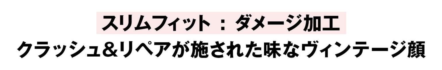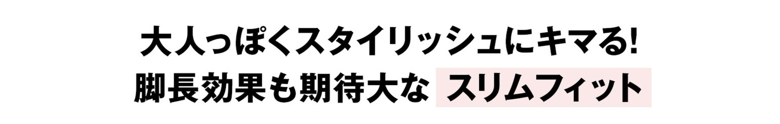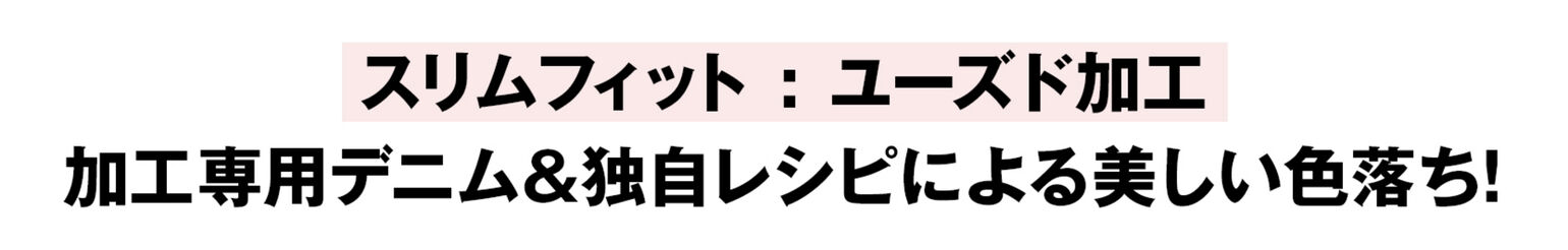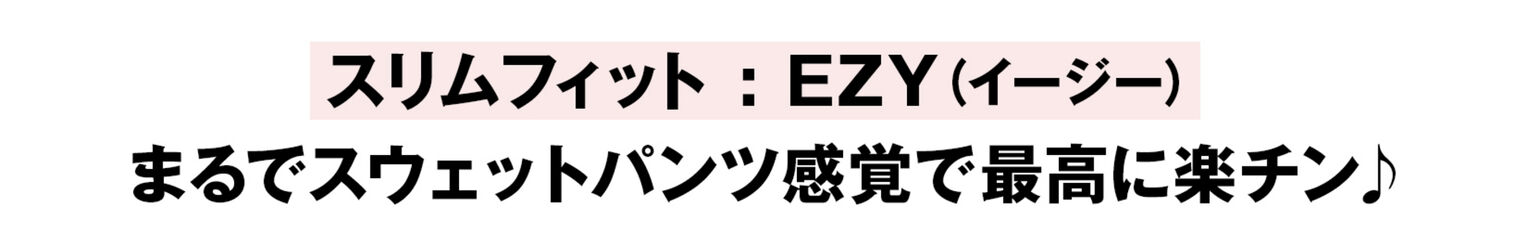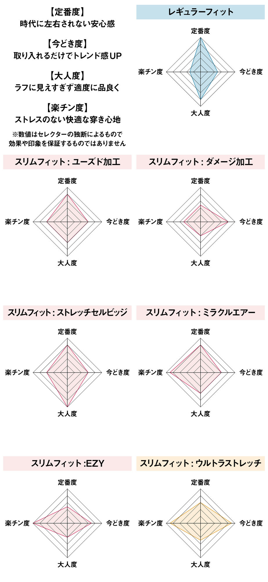 「現在の世の中の主流であるスリムフィットは、ユニクロでも最も人気のシルエットであり、生地や加工のバリエーションも充実。やや浅く設定されたローライズ(EZYジーンズのみミドルライズ)の股上と、スッキリとまとめられた腰回り&太腿、そして裾に向かって自然と絞られた細身のストレートに、ポケットの位置や角度の工夫が相まって脚長効果も望めます。ジーンズとはいえルーズな印象を与えず、大人っぽくスタイリッシュなスタイルを演出してくれます」