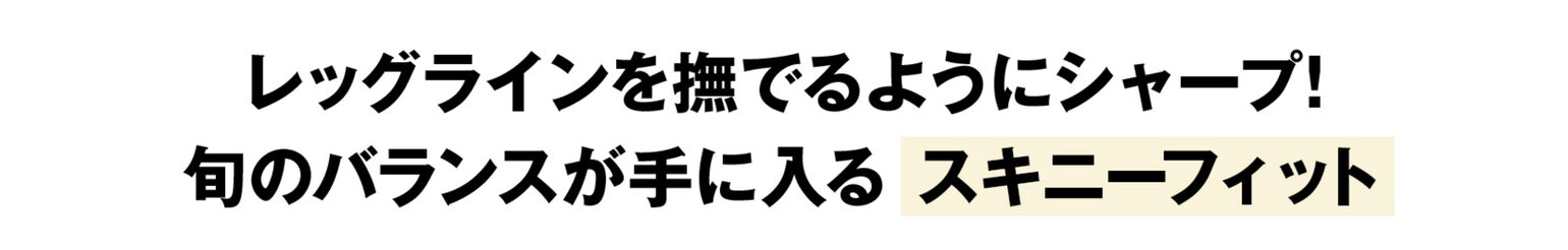 「最も細身となるスキニーフィットは、股上&腰回りをはじめ、全体がコンパクトに抑えられたシャープなカッティングが特徴。これにより直線的なレッグラインが描き出され、脚線を美しく演出してくれます。流行継続のビッグシルエットのトップスとは特に相性が良く、そのボリュームを引き立て、今年らしいバランスへとまとめてくれる旬度の高いモデルです」