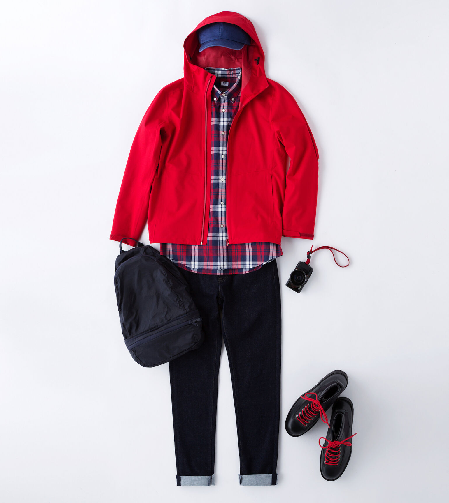 「旅行に行くとなると、色んなシーンに対応する必要があります。お寺に行ったり、街で買い物をしたり、美味しいものを食べたり。眺望の良いところを目指すと、ちょっとした山登りが必要な時もありますよね。そんな状況をイメージしてコーディネートしたのがこちら。機能的なシェルパーカにカジュアルなシャツ、そして動きやすいジーンズという組み合わせは、オーソドックスですがどんなシーンにもマッチするはず。このブロックテックパーカは、本格的なアウトドアにも対応する機能性がありながら、都会的なルックスも兼ね備えているのが魅力。旅のお供にまさにうってつけの一着ではないでしょうか」