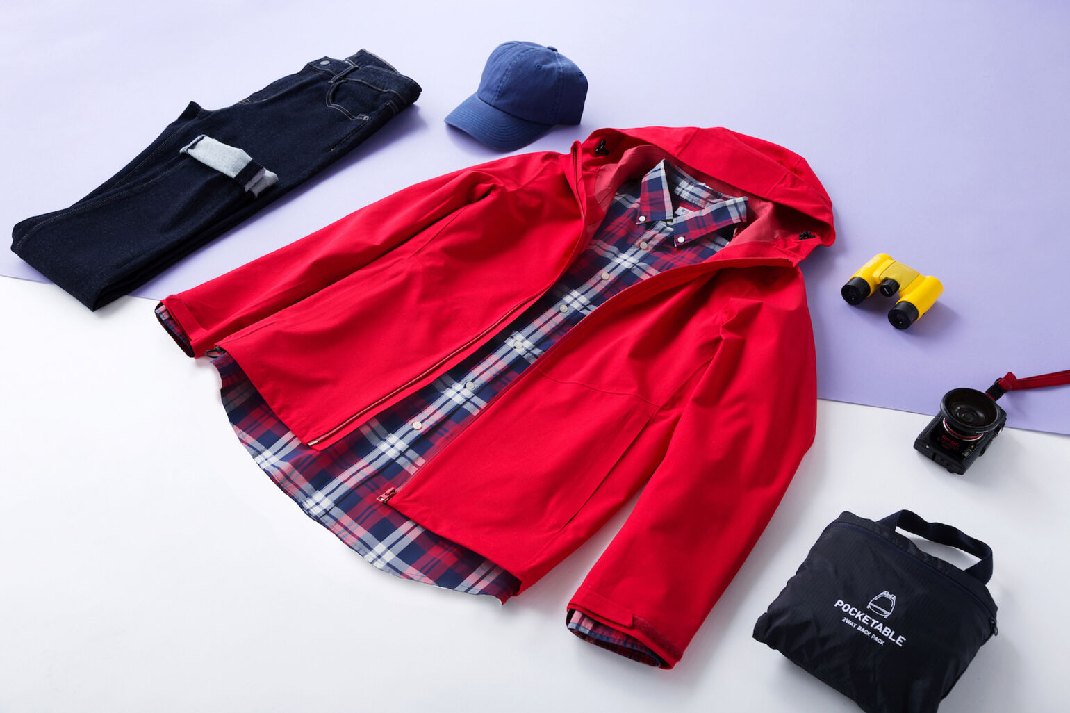 「旅に出るときにはアウトドアで言うところのレインシェル、つまり雨合羽を是非持って行きましょう。このブロックテックパーカは防水透湿素材で作られているので、雨や風は防ぎながらも体からの湿気は逃がすという機能を持っています。だから蒸れることがなくてとても快適。しかもストレッチ性もあるので、動きやすいんです。こういう機能的なシェルさえあれば多少の雨でも傘はいらないし、ウインドブレーカーとしても使えますからまさに万能。荷物も減らせて一石二鳥と言えるでしょう!」