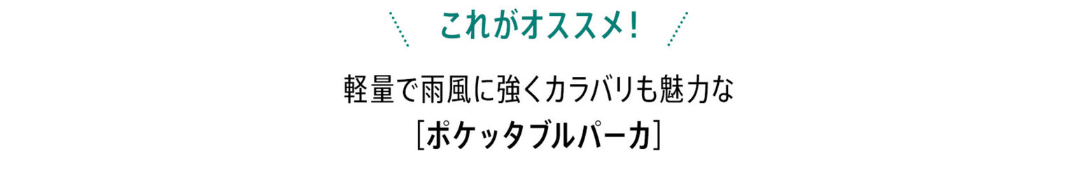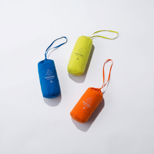 「天候変化や気温変化が気になる屋外イベントだからこそ、万能でコンパクトに収納できる上着が役立ちます。このポケッタブルパーカはとにかく軽くて、小さく収納できるのが魅力的。暑い日中はバッグにしまって、肌寒くなったらサッと取り出す、なんて使い方にピッタリなんです。撥水加工が施されているので、少しの雨くらいなら寄せつけないし、もちろん風もシャットアウト。そして何よりカラフルなバリエーションが揃っているので、フェスらしいコーディネートを楽しめるはずです!」