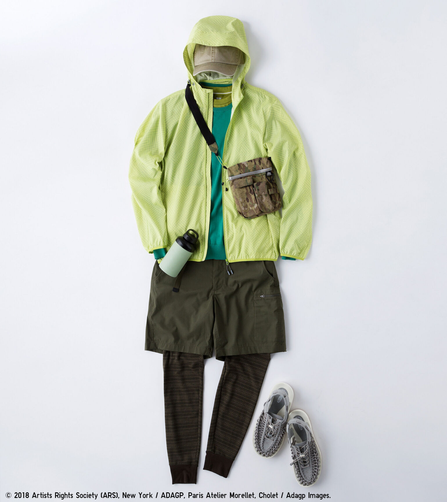 「フェスなどのイベントシーンではやっぱりカラフルなコーディネートが目を引きます。そこで今回はポケッタブルパーカとウォッシャブルクルーネックセーター、両者のカラーバリエーションを生かして、春の息吹を感じさせるような清々しいコーディネートを提案してみました。どちらもリーズナブルなので、普段はベーシックな色しか着ないという人も、是非カラーものに挑戦して頂きたいです!ボトムはタイツとショートパンツをレイヤリングして、動きやすさをアップすると同時にコーディネートのアクセントに。薄着になる季節はサコッシュもあると便利ですね。気分アゲアゲなカラフルコーデでイベントを楽しみましょう!」