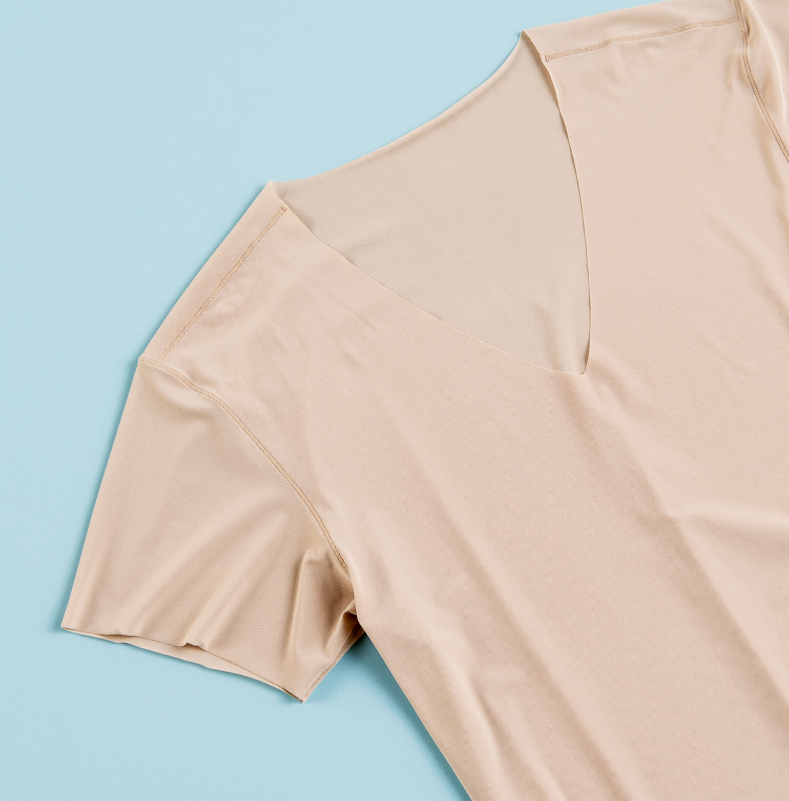 「肌透けや汗ジミの防止策として、シャツの中にアンダーウェアを着るのは非常に効果的です。色が透けにくい白のインナーを選ぶ方も多いようですが、最も透けないのはベージュ、つまり肌色のタイプ。特にネックライン&袖口の縫い目がないシームレス仕様であれば、シャツに響く心配はほとんどありません。
