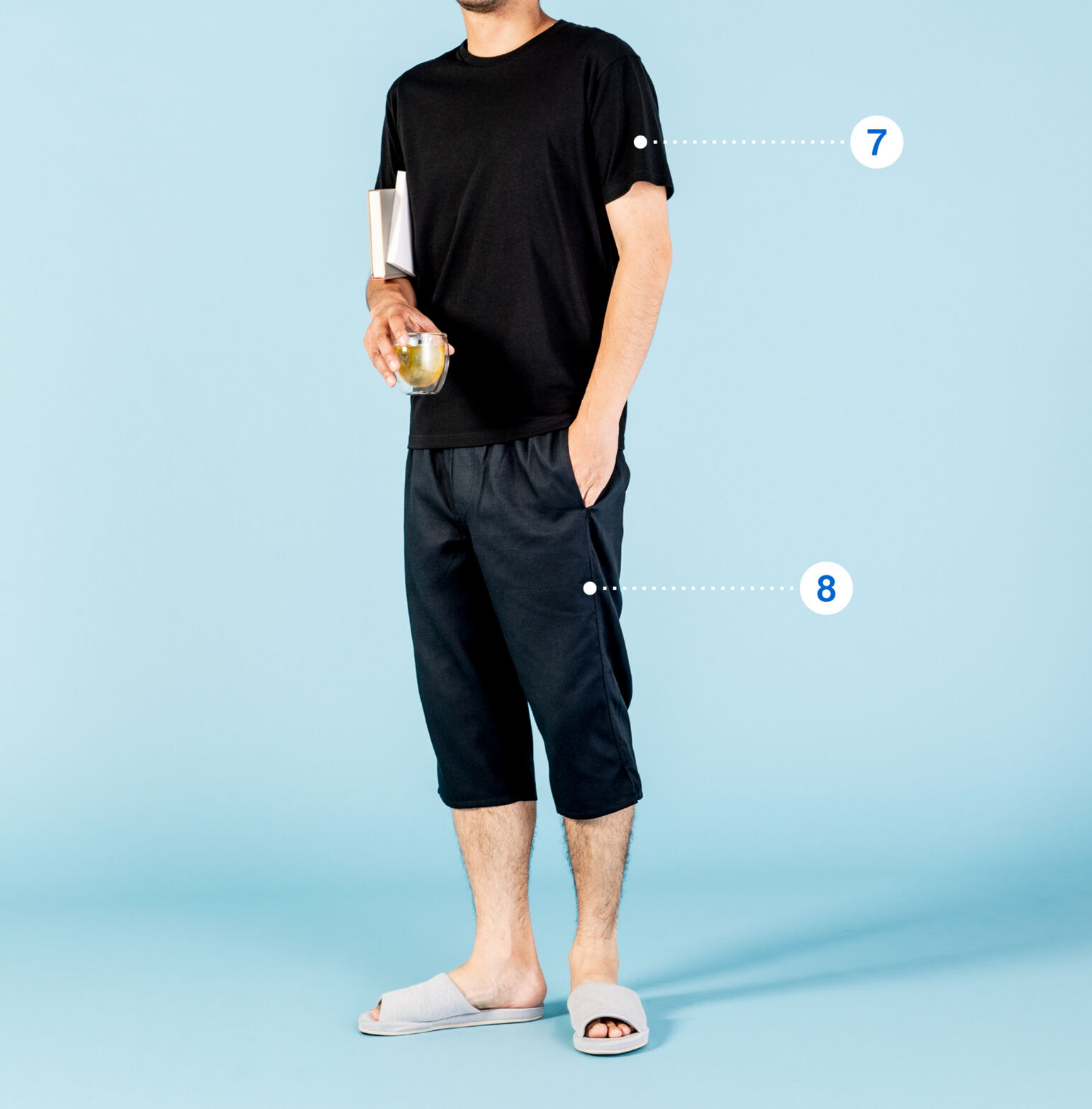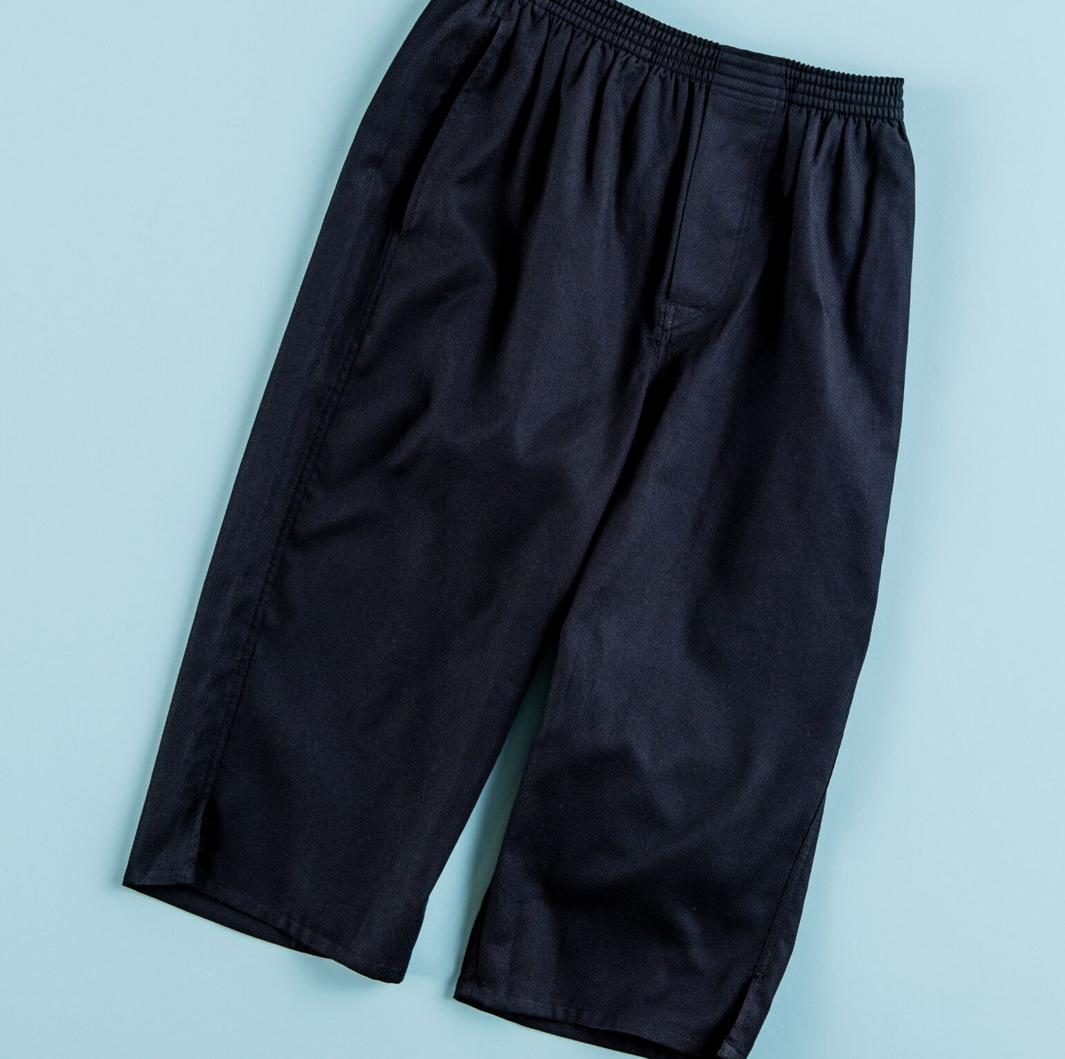 なかでも私がピックアップしたのは、街で穿く七分丈パンツのように合わせられ、よりステテコ感のない無地のタイプ。表面が凸凹としたドビー織りの生地は汗ばんでいてもサラリと肌離れが良く、またポケットの裏地がメッシュなので一段と蒸れにくい。上の着用写真のようにトップスと色を揃えてセットアップ風にコーディネートすると、いっそう部屋着っぽく見えず、そのまま近所やコンビニまで出掛けたり、ワンマイルスタイルとして十分に成立すると思います」