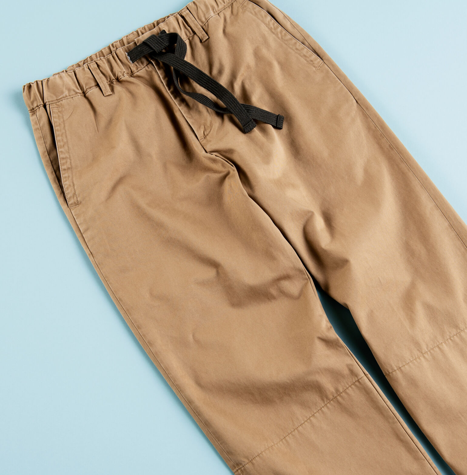 こちらの一本は、いま世界のファッションシーンが注目するロンドンのモードブランド〈JW ANDERSON〉とのコラボレーションアイテム。しっかりとした本格的なチノ生地が使われていますが、シルエットが太めなので上記の理由のようにストレスなく穿くことができます。またウォッシュ加工で柔らかくこなれた風合いに仕上げられ、さらにウエストが楽チンなイージー仕様も相まって、とても快適なんです」