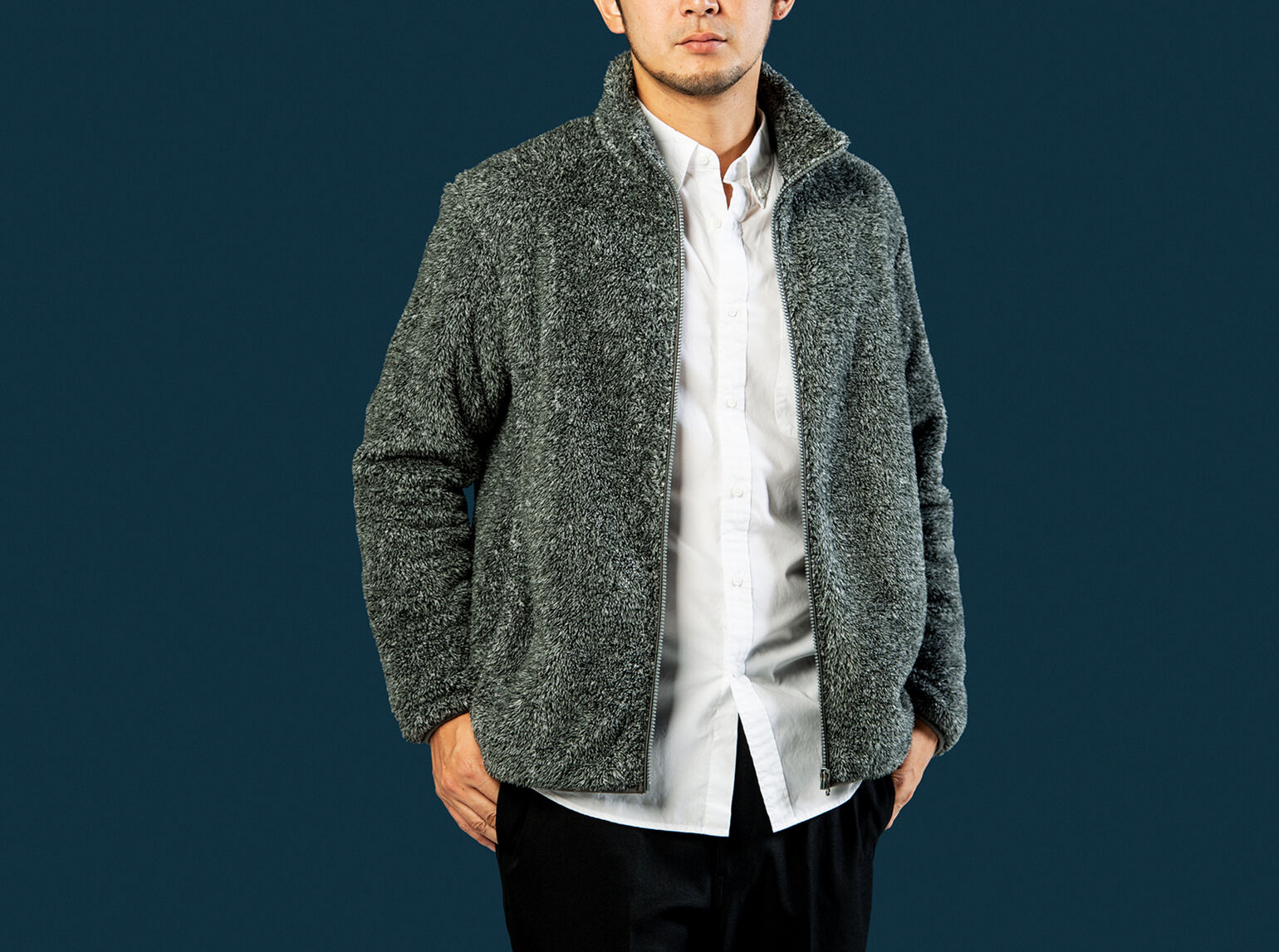 「近年のトレンドであり、その豊かな風合いにより存在感もあるボアフリースは、シンプルな着こなしでも十分に魅せられます。またフロントのジッパーを上まで閉じると防寒性が高まると同時に、合わせるインナーも悩まずに済みます。スラックスなどのキレイめパンツで大人っぽさを添えれば、手抜き感ゼロです」