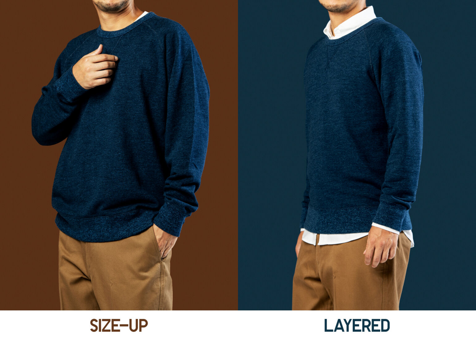 「近頃は、ゆったりシルエットのトップスが流行中。このトレンドを取り入れ、本来のジャストフィットより1~2サイズほど大きめを選ぶと、定番的なスウェットシャツをグッと今どきに着こなすことができます。またインにシャツを重ね着して、ハイゲージニットの代わりに使うのも有効。ニットを合わせるよりカジュアルな印象になり、断然こなれたルックスに」