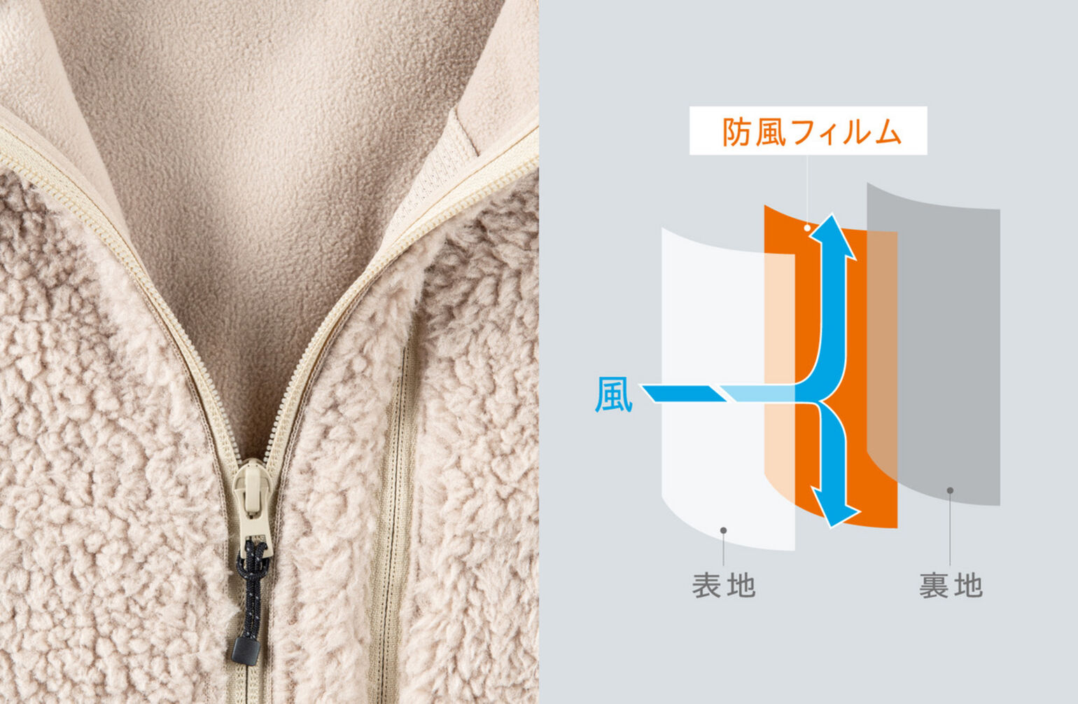 「表地にはモコモコのボアフリース、裏地には毛足の短い滑らかなフリース素材が使われているので、保温性は文句なし!加えて、その間に防風フィルムが挟み込まれた3層構造になっており、フリースの弱点である寒風の侵入もシャットアウトしてくれます」