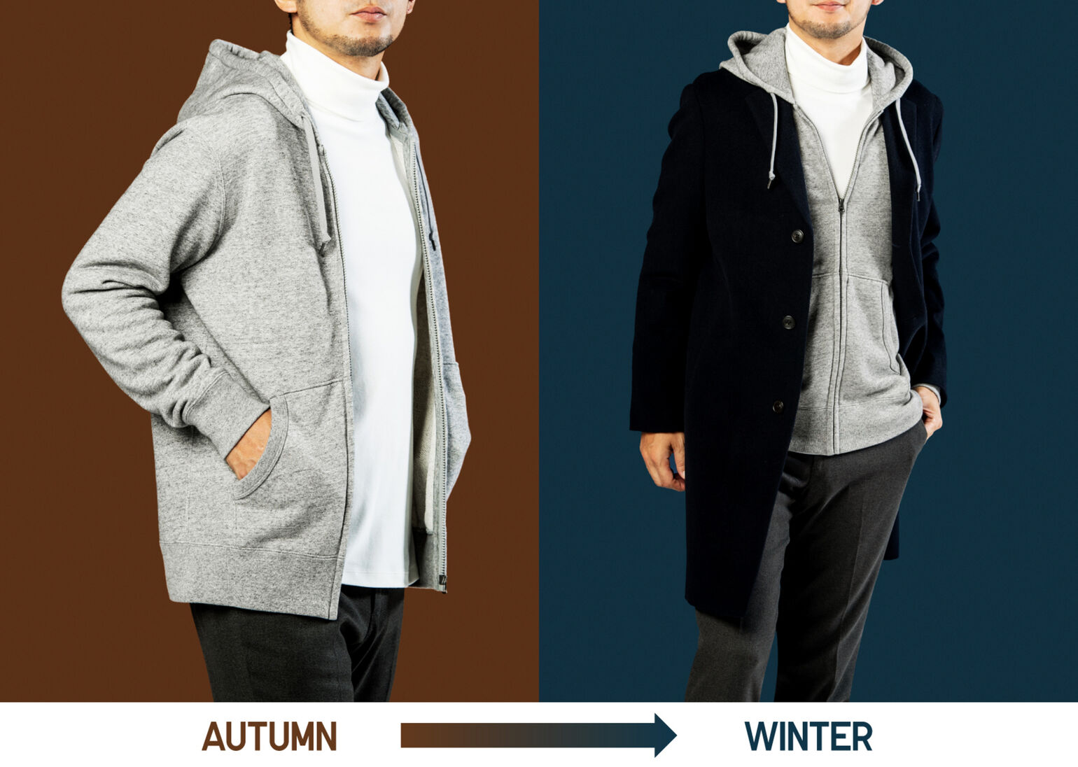 「カジュアルなアイテムなので、ラフになりすぎないようにシックなモノトーンでまとめたり、都会的なタートルネックやスラックスで品の良さを。冬も同じく、上から大人っぽいコートを羽織ります。こうしたクラシカルな装いのなか、ヌケ感のあるパーカがハズシの役割を果たし、こなれた印象に仕上がります」