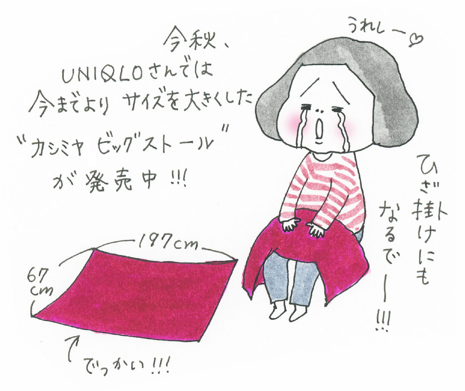 今秋、UNIQLOさんでは今までよりサイズを大きくした”カシミヤビッグストール”が発売中!!!うれしー♡ひざ掛けにもなるでー!!!