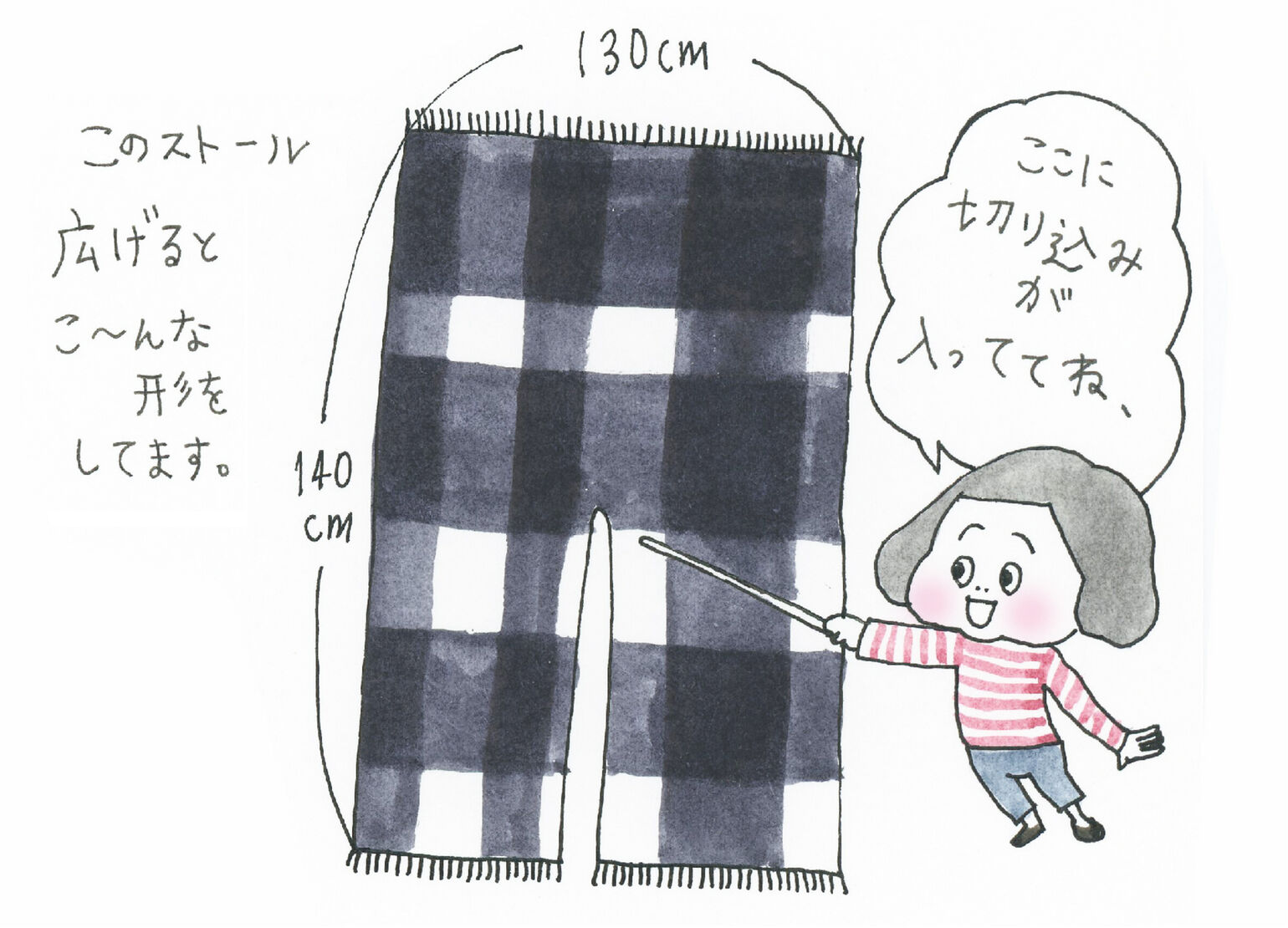 イラストのようなアウターの上に羽織るのも羽織りやすくって、ほんとこの切り込み、ストール界のパイオニアやでっ!!!と感動しております♡