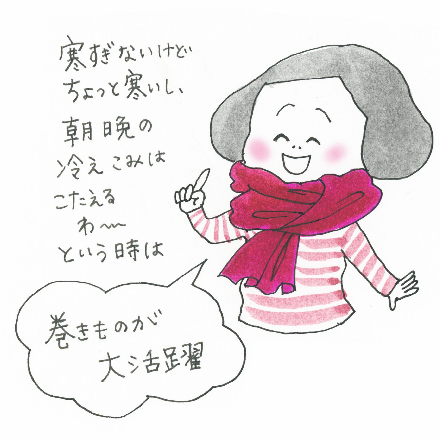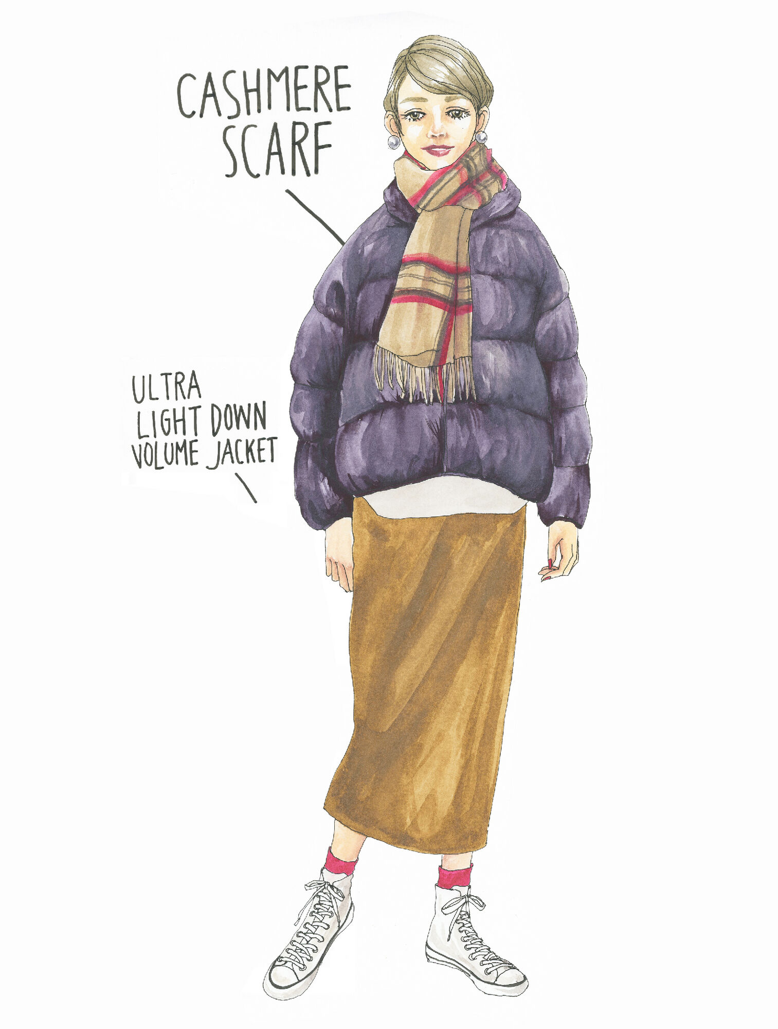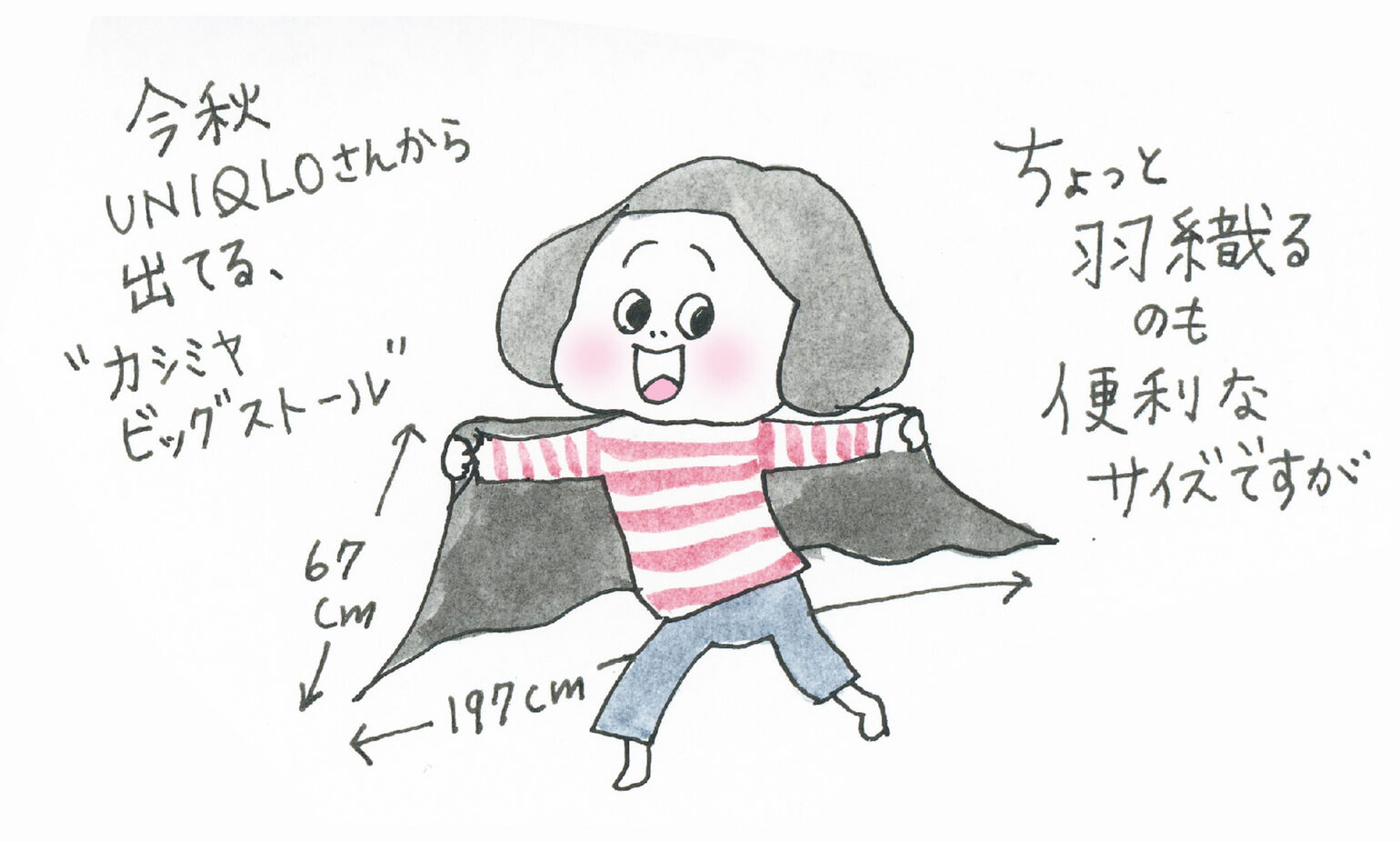 おしゃれなファッションイラストに、ご家族との生活を切り取ったイラストエッセイを添えたインスタグラムの投稿が大人気のイラストレーター、きくちあつこさん。トレンド感たっぷりのコーディネートは、真似しやすいテクニックも満載です。そんなファッション大好きなきくちさんが、ユニクロのアイテムを使って、リアルコーデを提案する企画、第3弾!今回は、寒い季節に大活躍するストール&マフラーを使ったおしゃれアイデアをご紹介いただきます。かわいい手描きコメントと一緒にお楽しみください。