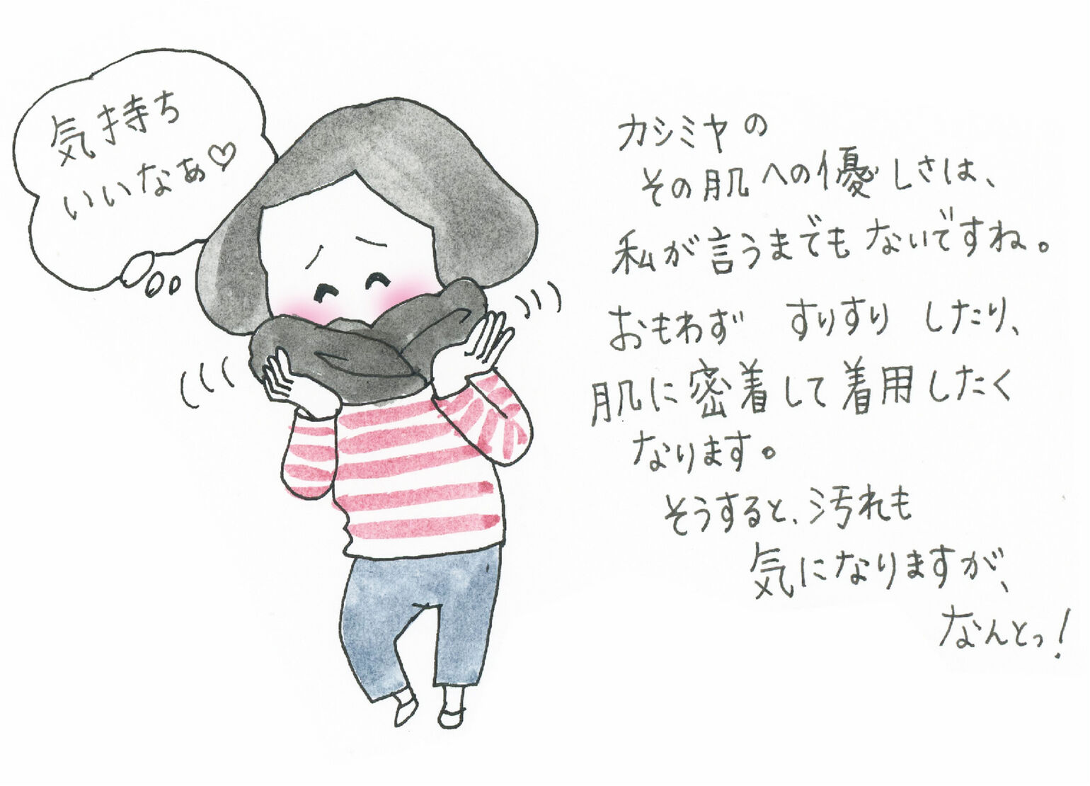 カシミヤのその肌への優しさは私が言うまでもないですね。おもわずすりすりしたり、肌に密着して着用したくなります。