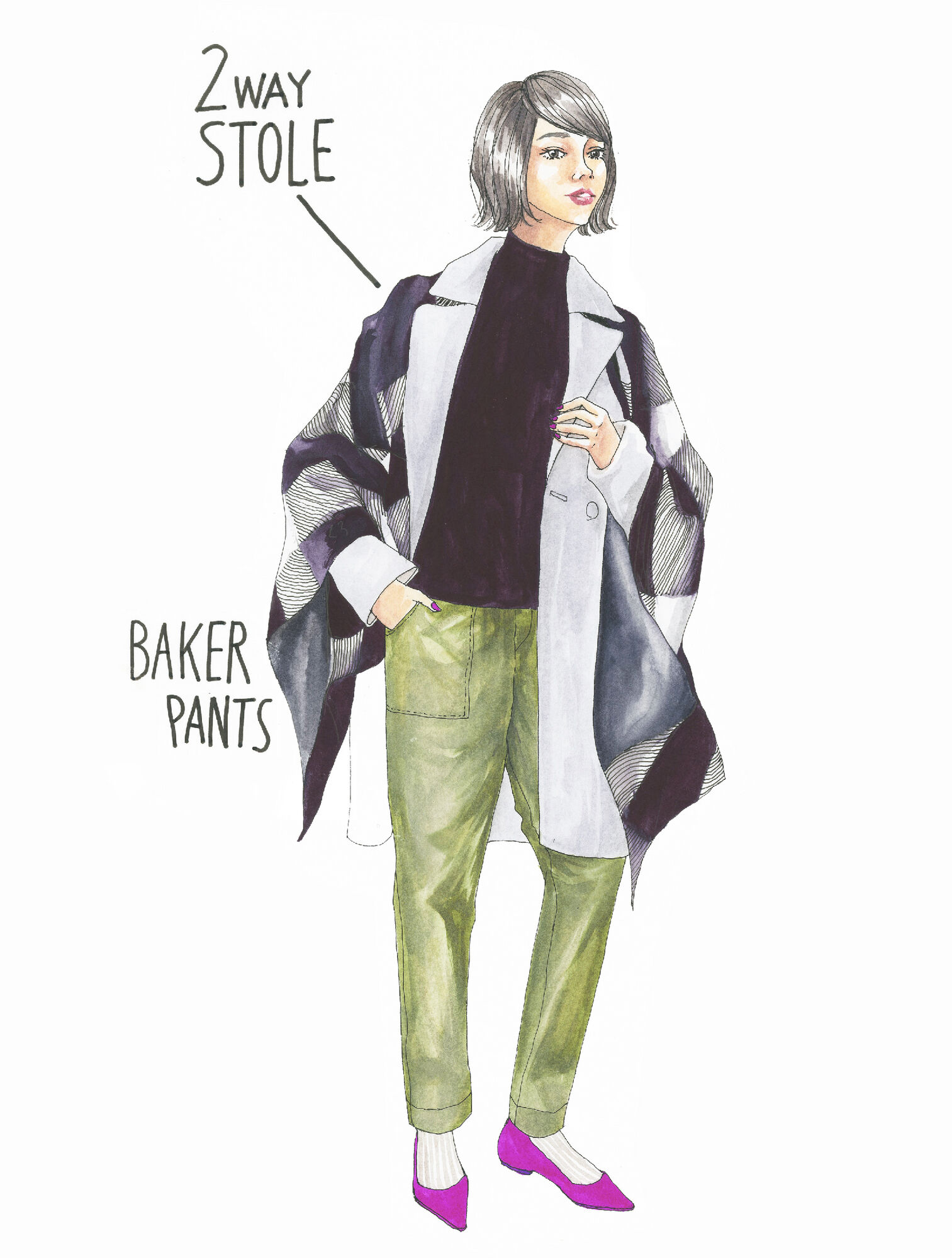 イラストのベイカーパンツとフラットシューズは春もの商品ですが、今からでも使えるし、めっちゃかわいい!!!
